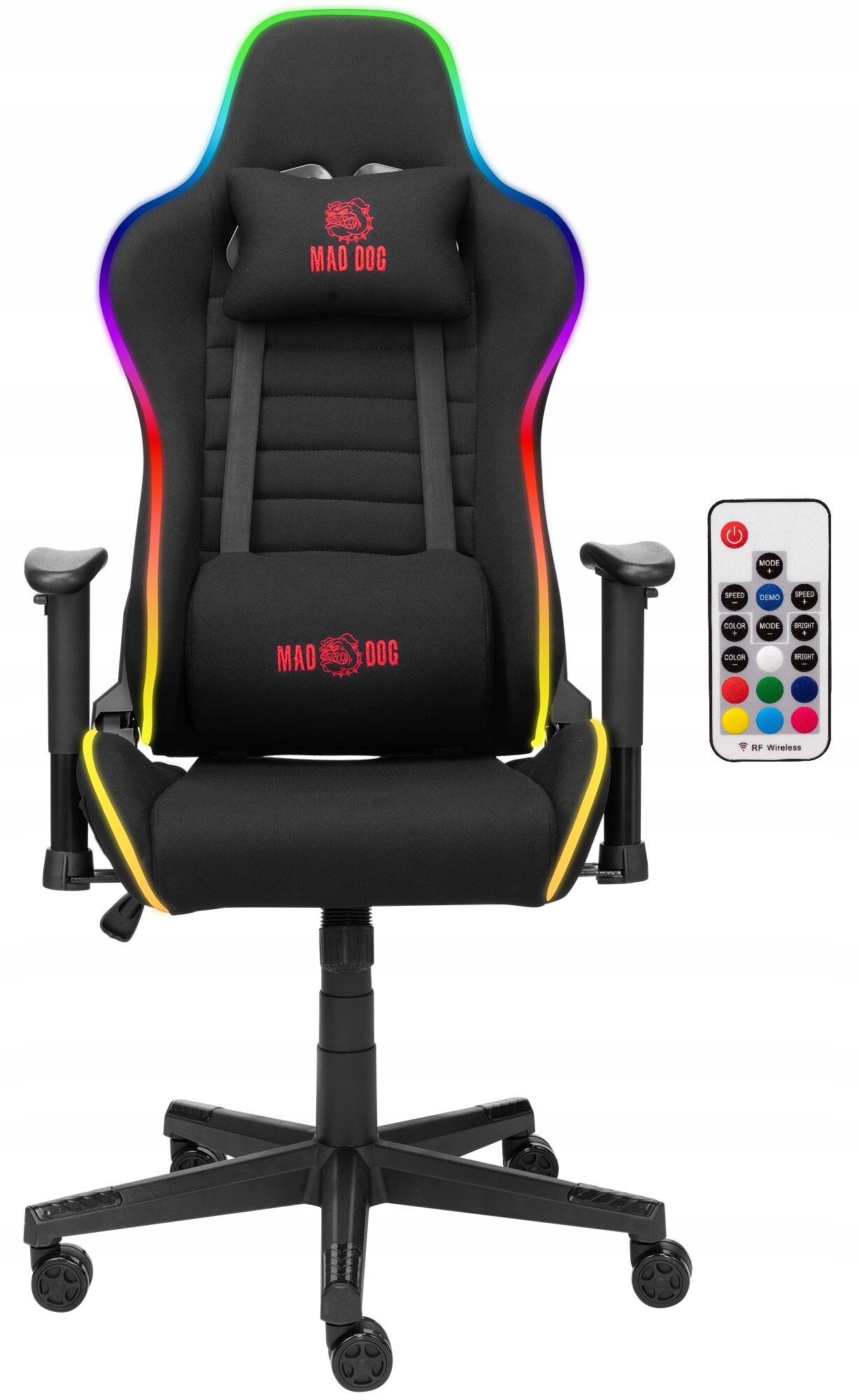 Fotel gamingowy MAD DOG GCH800 ma aż 27 trybów podświetlenia, które świetnie wpasują się do Twojego gamingowego setu i dodadzą klimatu Twojemu stanowisku. Oświetleniem możesz łatwo sterować za pomocą dołączonego do zestawu pilota, dzięki któremu nie tylko przełączysz się pomiędzy kolejnymi ustawieniami, ale także zwiększysz lub zmniejszyć jasność podświetlenia oraz ustawisz odpowiednią dla siebie szybkość działania danego trybu. Podświetlenie zasilane może być przez dołączony koszyk na baterie albo port USB-A w komputerze czy powerbanku (brak w zestawie).
