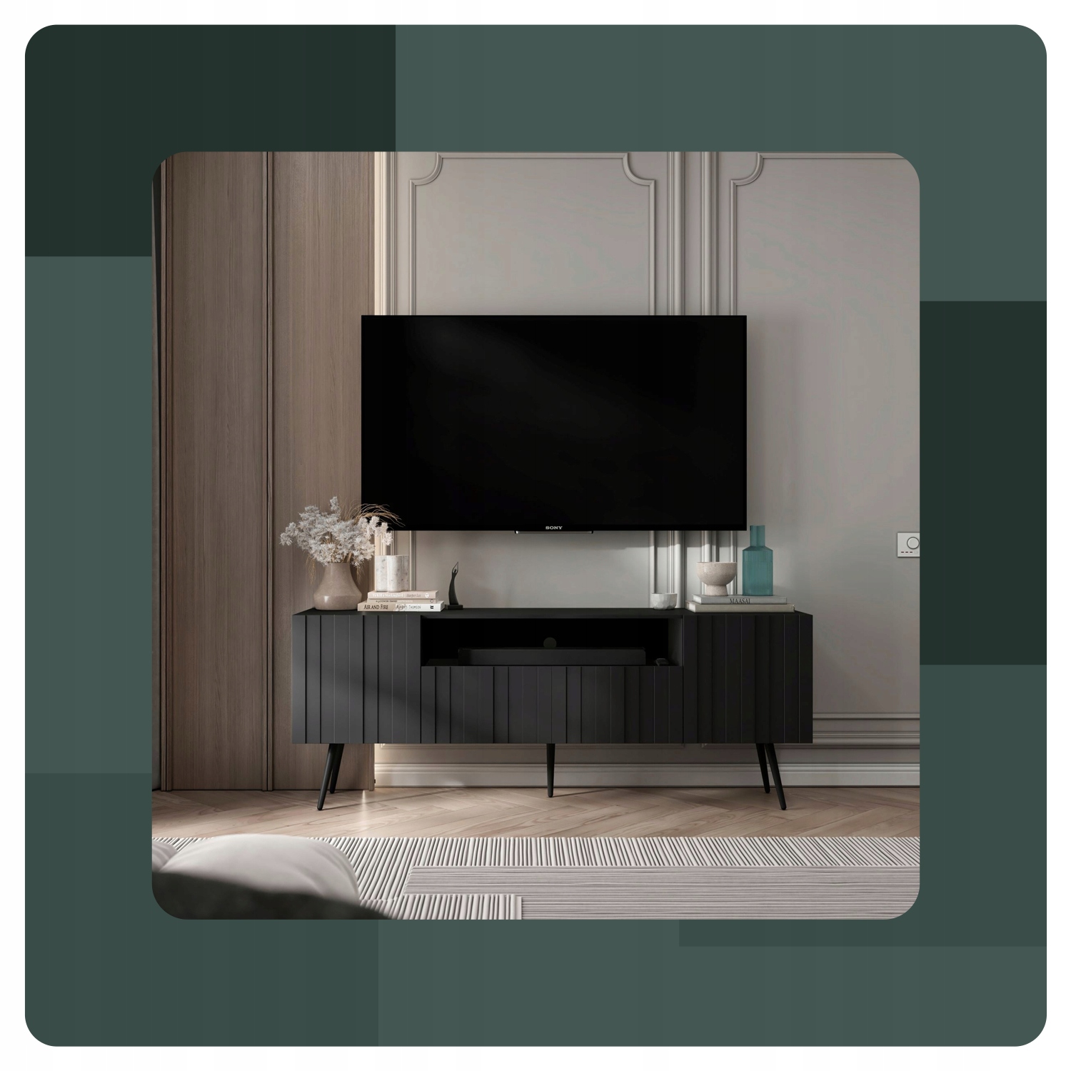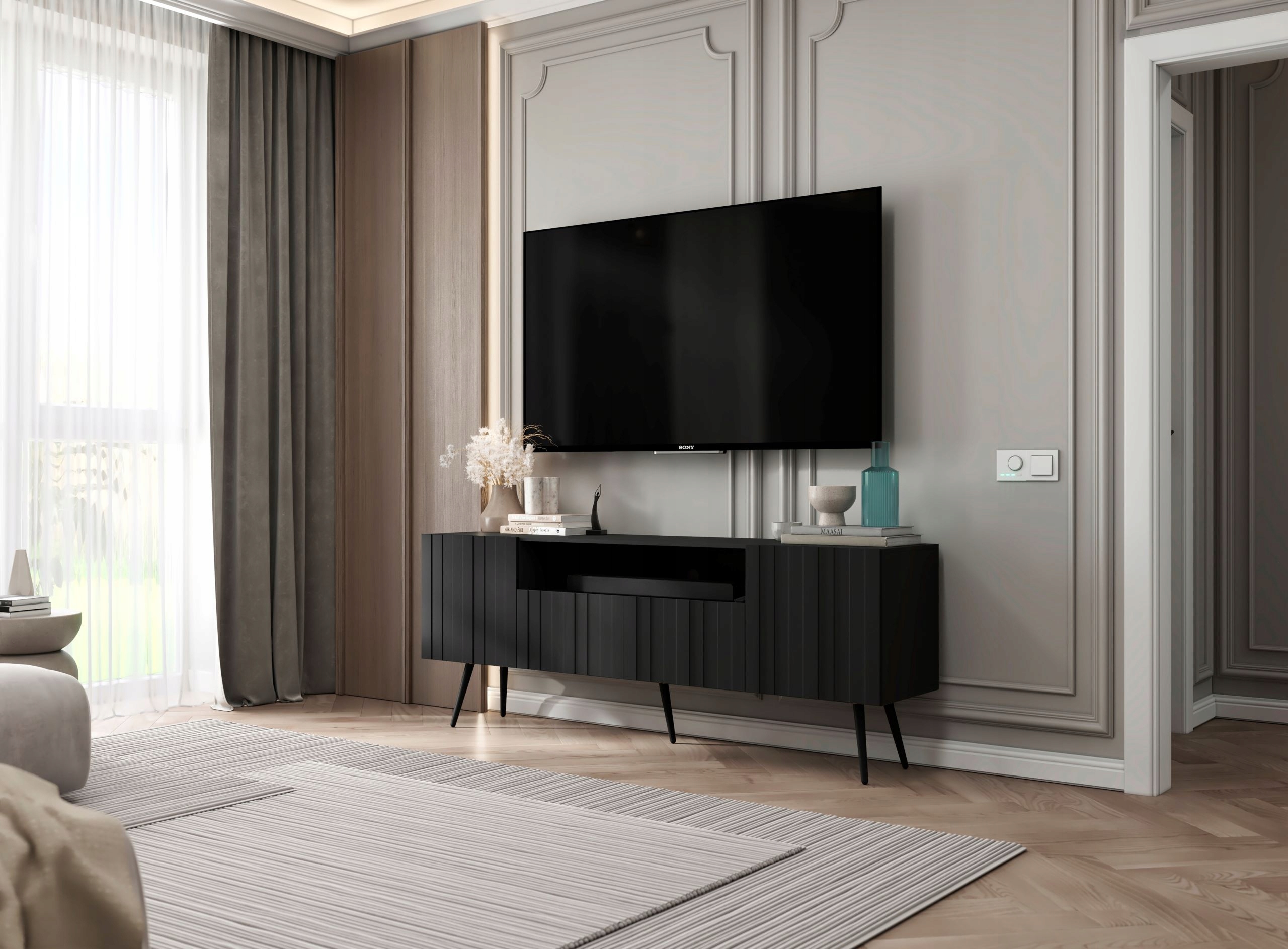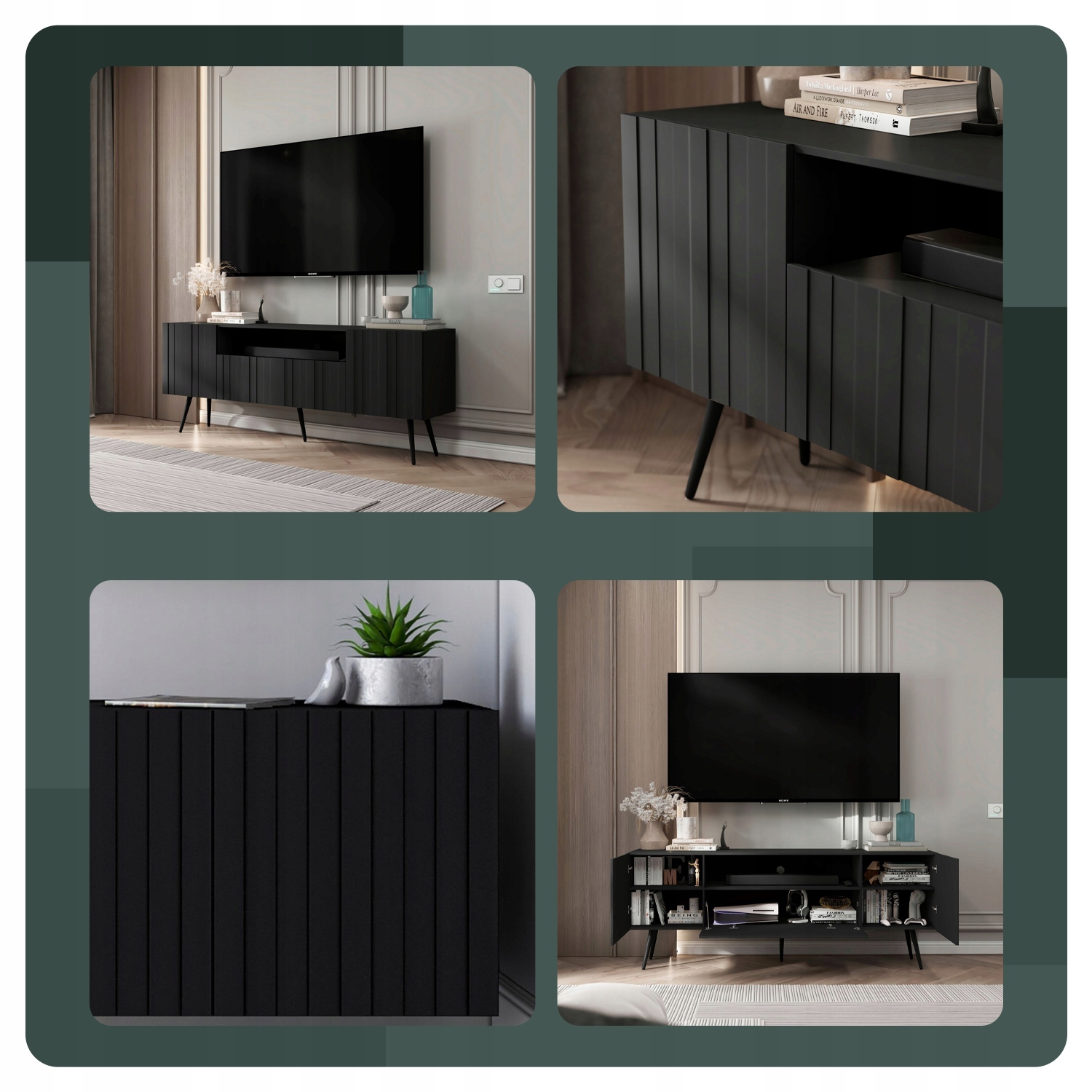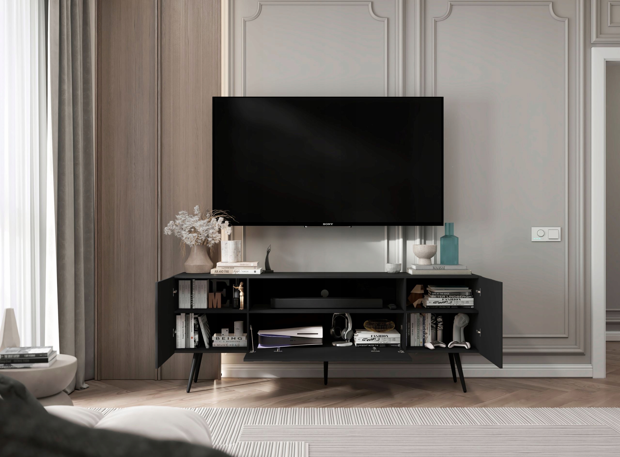 ✅ Możliwość regulacji wysokości półek wewnątrz mebla pozwala na idealne dostosowanie przestrzeni do Twoich indywidualnych potrzeb i sprzętu RTV.