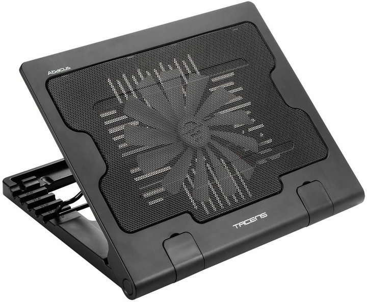 Posiada podwójną funkcję: podstawka chłodząca z 6-stopniową regulacją nachylenia ułatwiającą użytkowanie dowolnego laptopa z zewnętrzną klawiaturą i myszką, przy jednoczesnym optymalnym utrzymaniu go chłodzony cichym wentylatorem 180mm TACENS Abacus jest wykonany z wysokiej jakości komponentów, takich jak aluminium, stal i wytrzymały plastik ABS dla maksymalnej trwałości Marka Tacens Model Abacus Chłodnica do laptopów z funkcją podstawki.