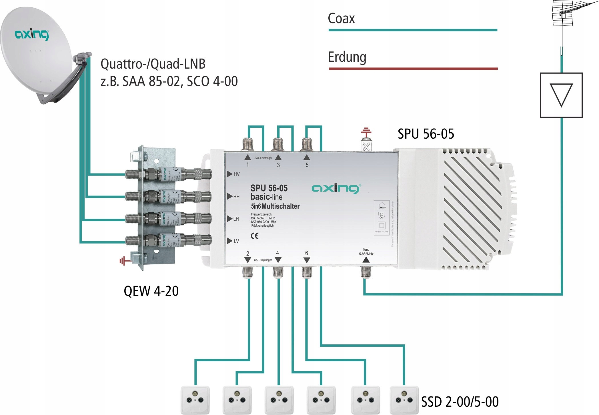 Podstawowy multiswitch 5 w 6 kompatybilny z HDTV. Komponent jest kompatybilny z czterema LNB, aktywnym SAT i pasywnym naziemnym. Wymiary to około 275 x 125 x 50 mm.
