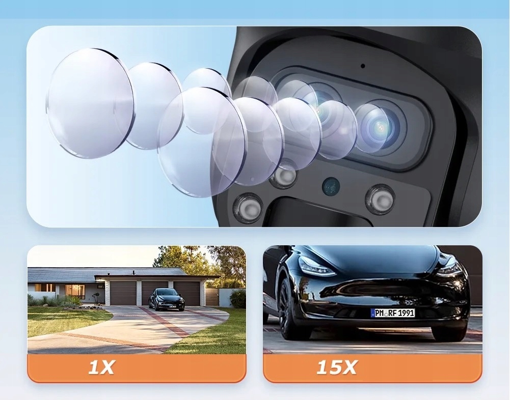 ✅ POTRÓJNY obiektyw - W aplikacji dostępne są 2 ekrany wideo, górny to kamera o stałej pozycji, a dolny to kamera obrotowa PTZ z 15x zoom