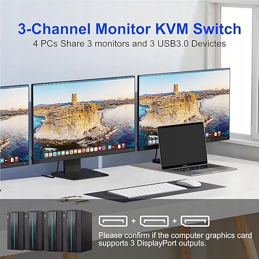 Przełącznik KVM DisplayPort 3 Monitor 4 Komputery Ten 3-monitorowy przełącznik KVM jest idealny do podłączenia 4 komputerów stacjonarnych lub laptopów, aby dzielić jeden zestaw klawiatury, myszy i 3 monitorów w celu rozszerzonego, lustrzanego wyświetlania; Idealny do komputerów z 3 monitorami Displayport do wyjść wyświetlania. Wymaga, aby każdy laptop/komputer PC obsługiwał 3 lub więcej ekranów i musiał obsługiwać rozszerzone wyświetlanie.
