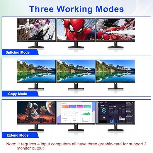 2. Ten 3-monitorowy przełącznik KVM z 4 portami nie oznacza, że można go podłączyć tylko do 4 komputerów. Teraz możesz mieć tylko 2 komputery, ale w przyszłości możesz potrzebować 3 lub 4 komputerów, wtedy możesz wybrać ten przełącznik. Przed zakupem upewnij się, że każdy z Twoich komputerów obsługuje potrójny wyświetlacz.