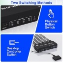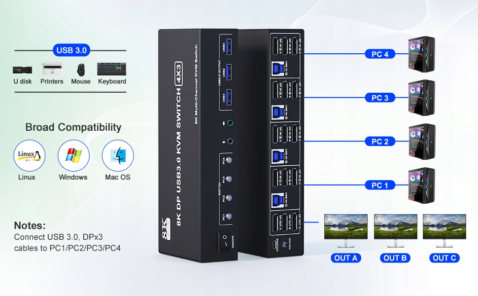 Przełącznik KVM 3 monitory 4 komputery obsługują Ultra HD 8K@60Hz Przełącznik KVM 3 monitory DisplayPort: obsługuje rozdzielczość do 8K@30Hz/4K@144Hz i wstecznie kompatybilny z niższą rozdzielczością. Uwaga: ostateczna rozdzielczość zależy również od kart graficznych, monitorów, kabli i adapterów.