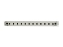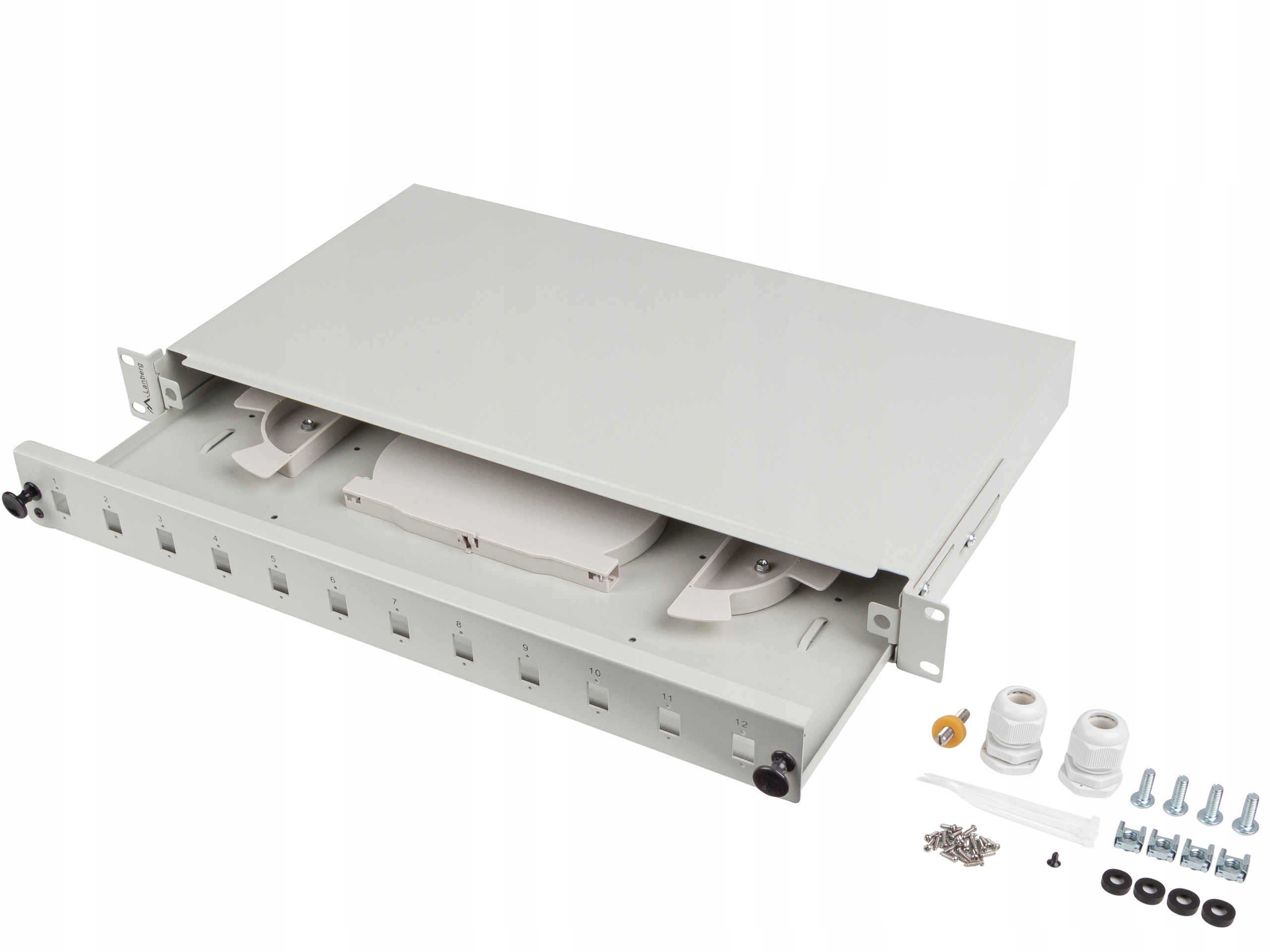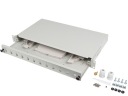 Przełącznica światłowodowa rack 19" 1U w kolorze szarym wspiera konfiguracje 12XSC simplex oraz 12XLC duplex. Jej konstrukcja z 1.2 mm blachy stalowej, lakierowanej proszkowo, gwarantuje trwałość i stabilność. Panel przedni jest wyposażony w wyraźną numerację portów, co ułatwia organizację oraz zarządzanie połączeniami. Dodatkowo, panel ten umożliwia szybkie wysunięcie szuflady, co ułatwia dostęp i instalację światłowodów. Wyposażenie tylnego panelu obejmuje pięć wejść kablowych w tym 4 otwory o średnicy 22 mm oraz specjalne wejście na kable DROP. Szuflada posiada tacki spawów z tworzywa ABS, uchwyty kablowe i przetłoczenia, które pozwalają na bezpieczne mocowanie kabli za pomocą opasek zaciskowych.