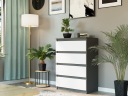 Stylowa komoda z kolekcji MODERN, stworzona dla ludzi, którzy cenią sobie nowoczesny styl i elegancję. Odnowi wnętrze każdej sypialni i salonu. Konstrukcja jest minimalistyczna ale solidna i trwała. Dzięki bezuchwytowym frontom szuflad komoda jest wygodna w użytkowaniu. Ergonomiczne wymiary komody zapewniają swobodę w umeblowaniu pomieszczenia.