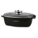 Prostokątna brytfanna Konighoffer Pollo (pojemność 5,5 l) zapewni ci wysoki poziom komfortu podczas gotowania. Ochroni składniki przed przypaleniem oraz przywieraniem. Równomiernie i szybko się rozgrzeje. Pozwoli na efektywne duszenie pod przykryciem i śledzenie na bieżąco procesu przygotowywania posiłku. Zyskujesz wieloletnią trwałość dzięki korpusowi z odlewu aluminiowego die cast i powłoce marmurowej PFOA Free typu stone o odporności na wiele cykli ścierania. To opcja dla każdego, kto ceni sobie zdrową i pełnowartościową dietę, np. przygotowaną na minimalnej ilości tłuszczu. Bezproblemowa pielęgnacja i długa żywotność naczynia stylizowanego na marmurowe to inne podstawowe korzyści z zakupu tego modelu brytfanny imitującej wzór granitu. Masz możliwość użytkowania jej na wszystkich typach kuchenek. Produkt sprzedawany jest w zestawie ze szklaną pokrywką wyposażoną w aromatyzer. Można używać jej w piekarniku w max. 220 st. C, ale bez pokrywy.