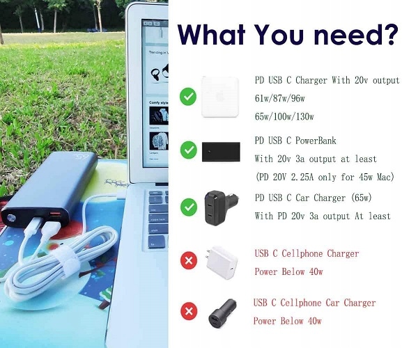 Kabel USB-C do Magsafe 2 (T-Tip) jest kompatybilny z MacBookiem Air Pro po 2012 roku, nie pasuje przed 2012 rokiem. Ten adapter USB-C do Mag-safe może łatwo ładować komputer za pomocą zasilacza USB-C (uwaga: nie wszystkie adaptery USB-C działają, działa tylko APPLE 61 W/87 W, więc możesz używać tylko oryginalnego APPLE USB- C) lub niektóre przejściówki USB-C są zgodne z MacBookiem. Upewnij się, że wat zasilacza USB-C jest równy lub większy niż wat MacBooka. . Ten kabel USB-C to tylko przewód, który transportuje prąd, musisz zapewnić prawidłowe urządzenie wyjściowe mocy, urządzenie komputerowe może działać normalnie. Urządzeniem wyjściowym zasilania może być zasilacz USB-C i Power Bank (wyjście: 16,5 V ---3,65 A), a komputer nie będzie działał poniżej 14,5 V. Telefon i zasilacz Pad nie działają. obsługuje zasilacz USB C 87 W / 61 W. Chociaż to złącze może pasować do wielu różnych komputerów Macbook. Jednak różne komputery Macbook mogą wymagać różnych napięć i prądów. Upewnij się, że źródło zasilania podłączona końcówka złącza typu c (taka jak adapter USB-C 61 W/87 W) może dostarczać prawidłowe napięcie i prąd dla komputerów Macbook.
