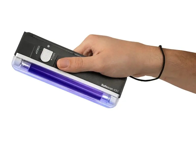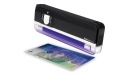 Safescan 40Hto poręczny, kompaktowy, przenośny tester do wykrywania falsyfikatów, który możesz zabrać w każdą podróż. Lampa UV sprawdza zabezpieczenia ultrafioletowe banknotów, dowodów tożsamości, kart kredytowych i wszystkich innych dokumentów urzędowych. Wbudowana latarka pozwala sprawdzać również znak wodny i nitkę zabezpieczającą.