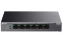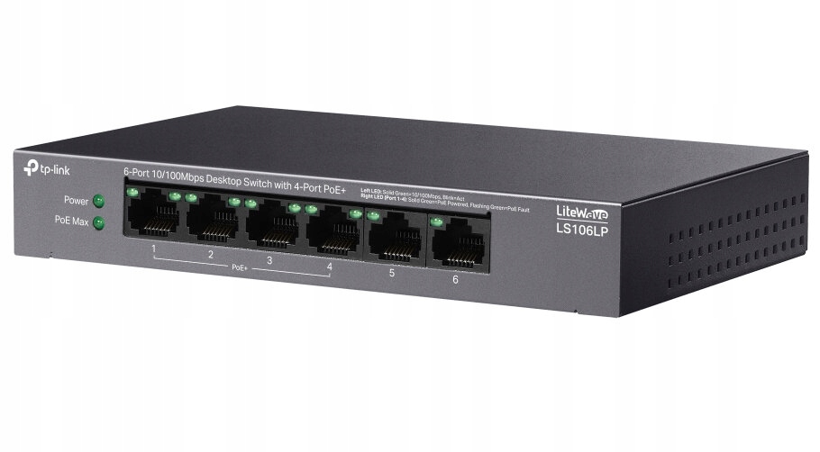 TP-LINK LS106LP to kompaktowy przełącznik typu desktop, wyposażony w 6 portów 10/100 Mb/s, z których 4 obsługują technologię PoE+ (Power over Ethernet). Dzięki temu urządzenie może dostarczać zarówno dane, jak i zasilanie za pomocą jednego kabla Ethernet, co jest idealne dla kamer IP, punktów dostępowych oraz telefonów IP.
