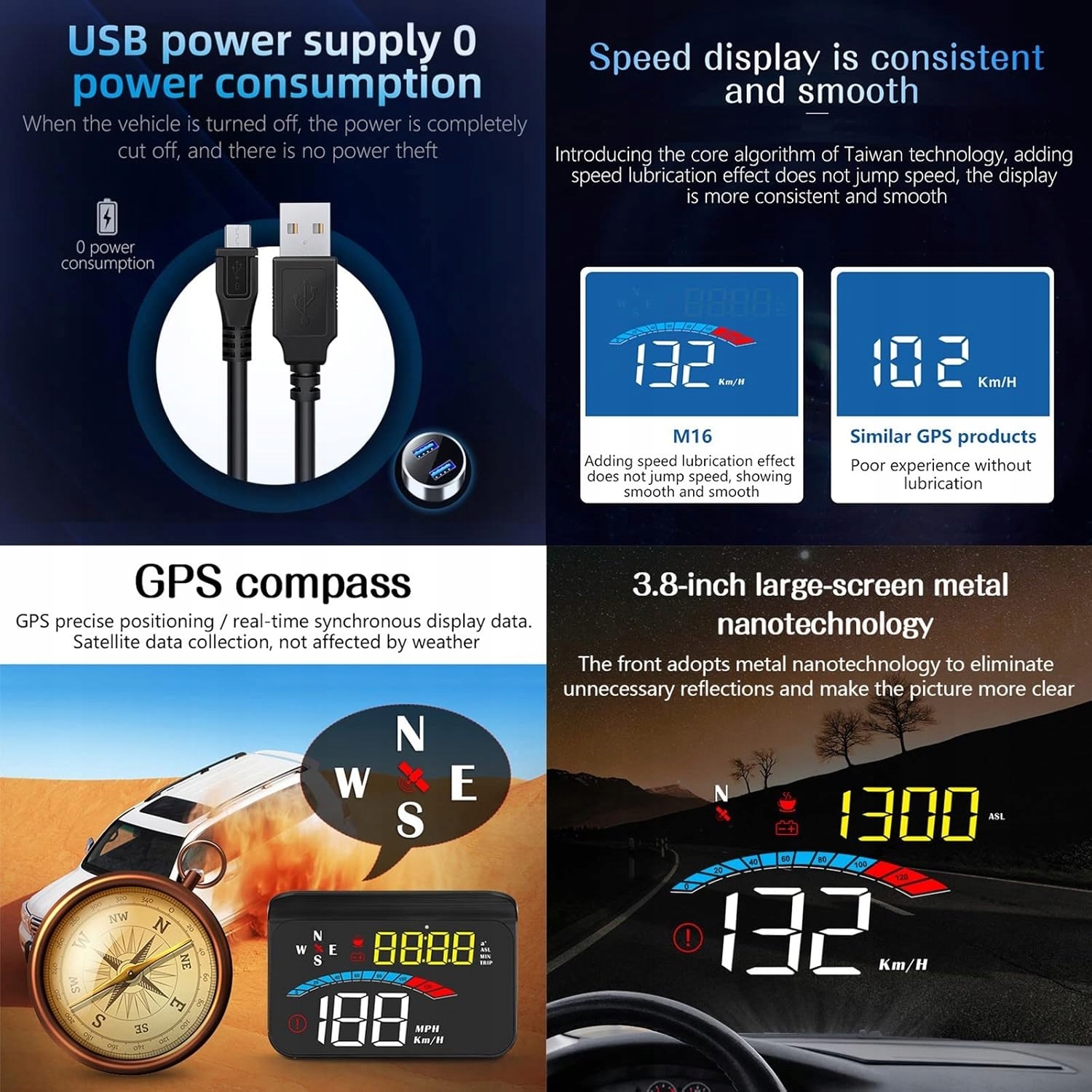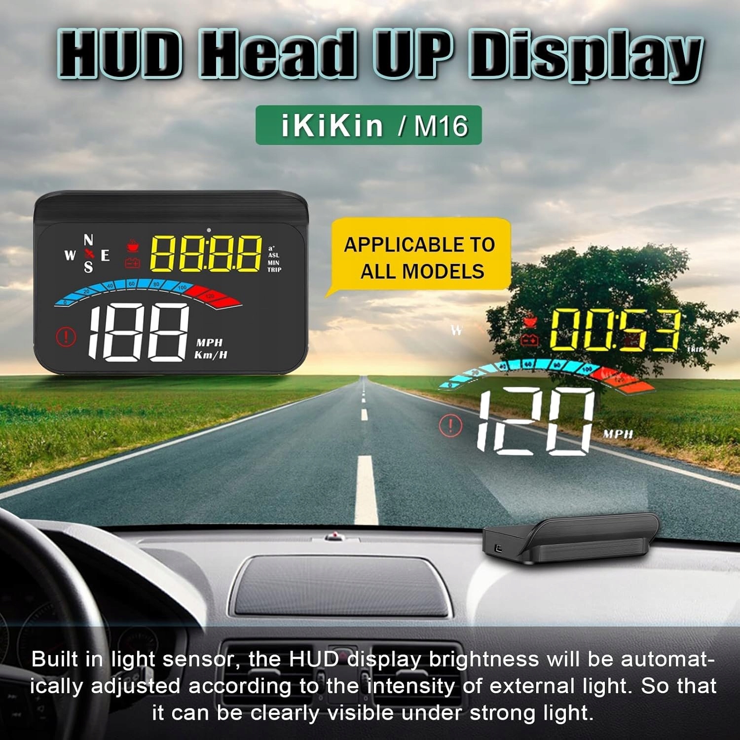 Duży ekran HUD i wyraźny wyświetlacz: HUD posiada 3,5-calowy ekran i wyświetlacz Full HD. Montowany w samochodzie wyświetlacz head-up M16 ma wbudowaną osłonę obiektywu, która pomaga wyraźnie odczytywać dane bez podwójnych obrazów. Czujnik światła pomaga wyświetlaczowi head-up automatycznie dostosować jasność do otoczenia.