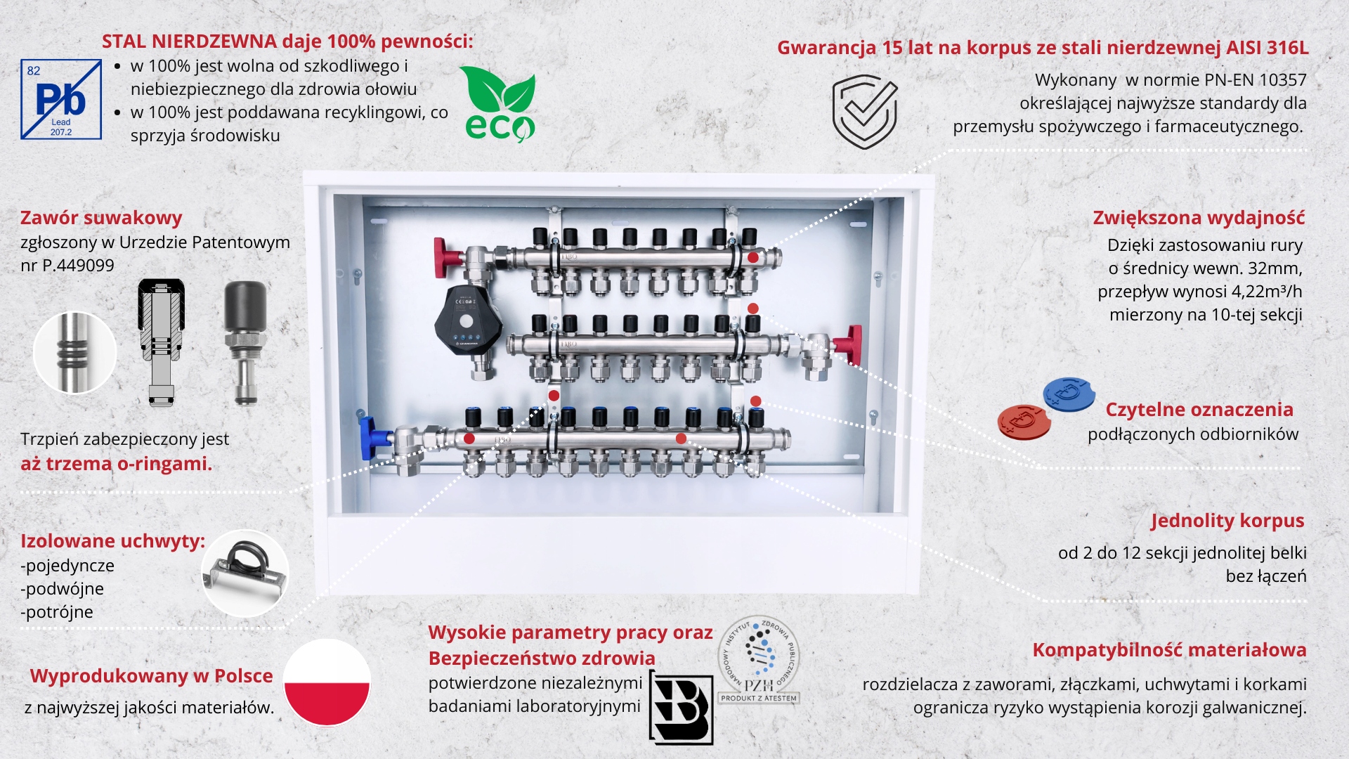Ten wysokiej jakości stop metali gwarantuje długotrwałą i niezawodną pracę rozdzielaczy, bezpieczeństwo, wysoką wytrzymałość oraz estetykę produktu.