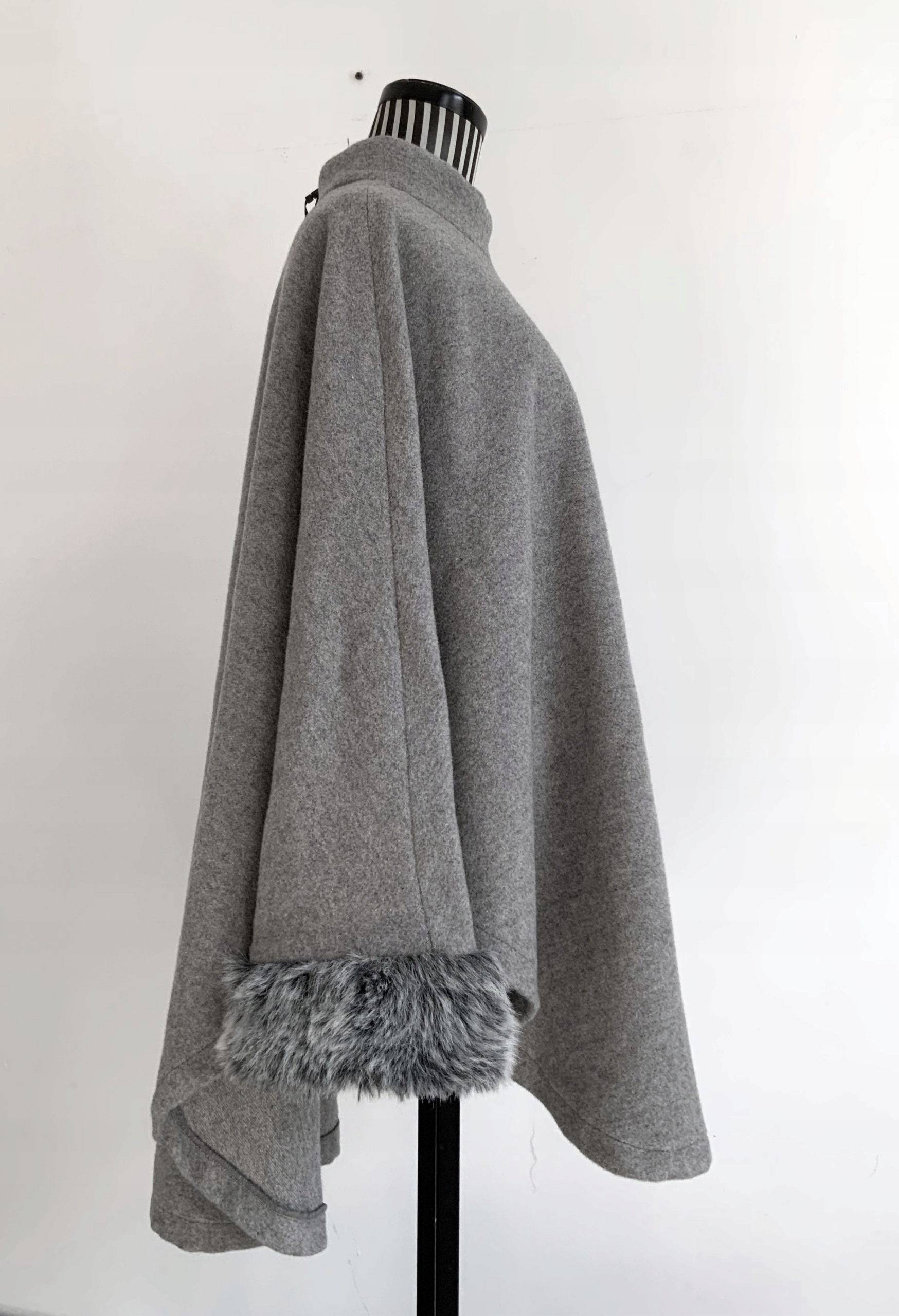 Piękne ponczo z flauszu z wełny. Kolor szary melanż. Na ramieniu zapięcie na zamek. Pod szyją niewielka stójka. Rękawy obszyte sztucznym futerkiem. Stan nowe z metką.