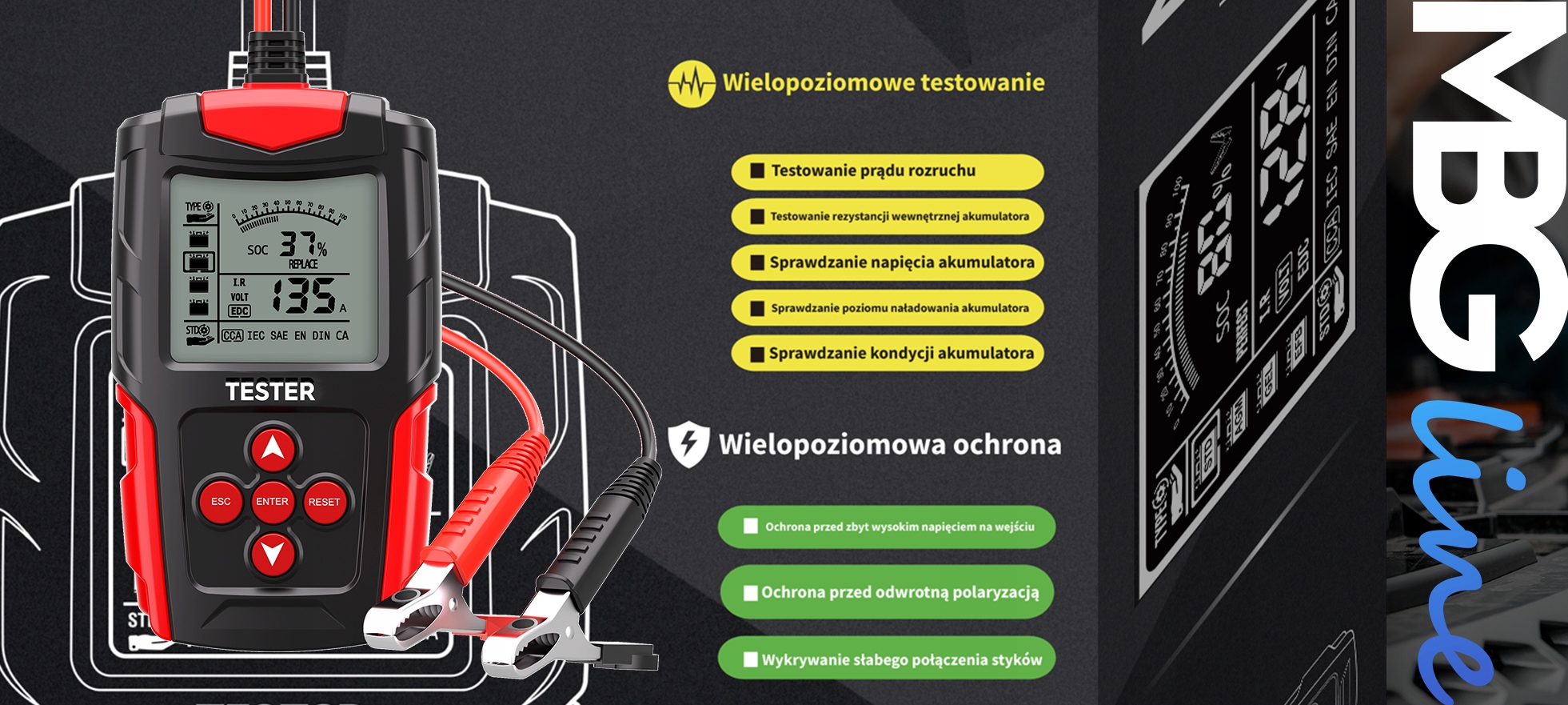 Четкий ЖК-дисплей - одно из многочисленных преимуществ этого устройства. Все необходимые параметры в одном месте. С помощью тестера батареи марки MBG line анализ состояния она никогда не была проще.