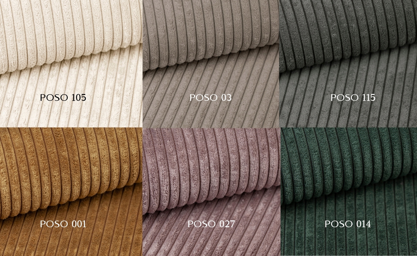 POSO sztruks obiciowy to tkanina o bardzo wyrazistej, prążkowanej strukturze, która jest miękka i trójwymiarowa. Ten gruby sztruks doskonale sprawdza się w roli tapicerki na obszerne sofy, siedziska, poduszki, elementy dekoracyjne, a nawet legowiska dla zwierząt. Wytrzymałość i trwałość tej tkaniny gwarantują jej długowieczność i odporność na zużycie.