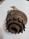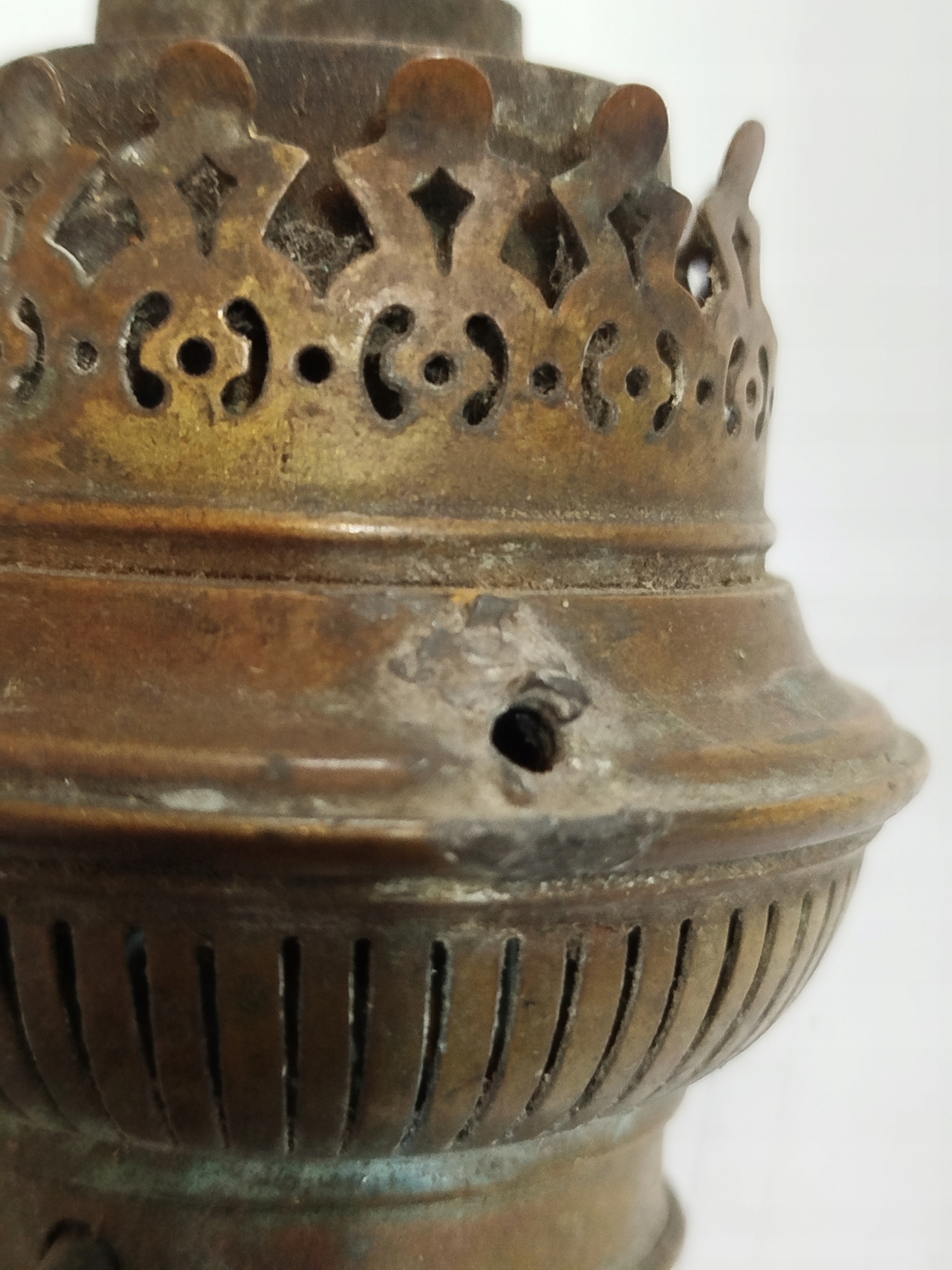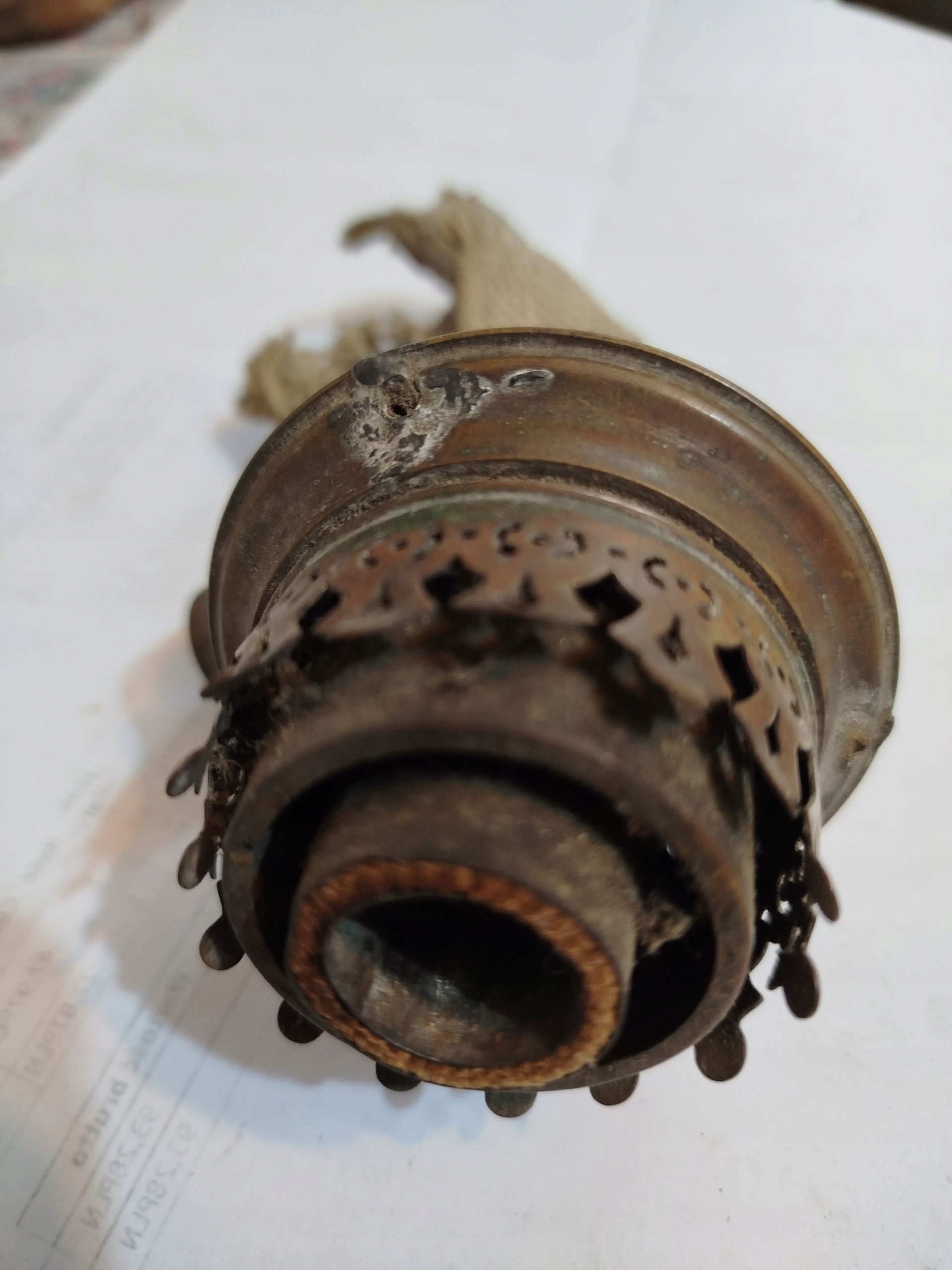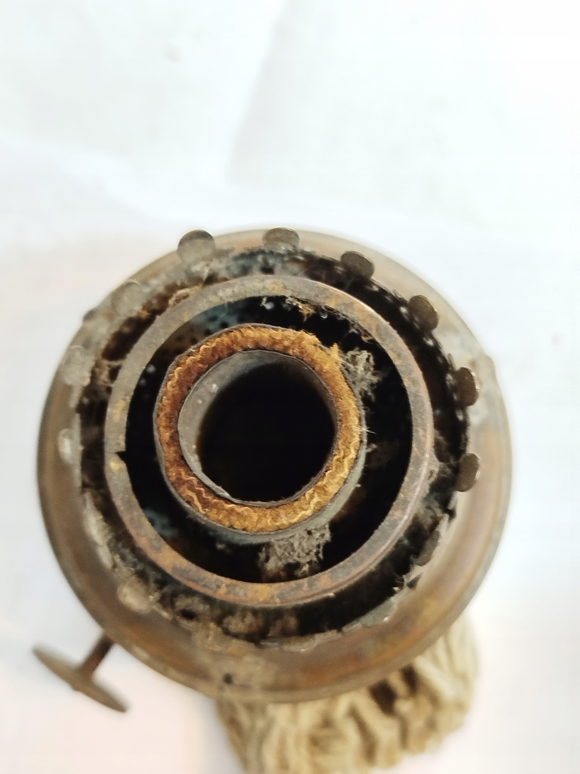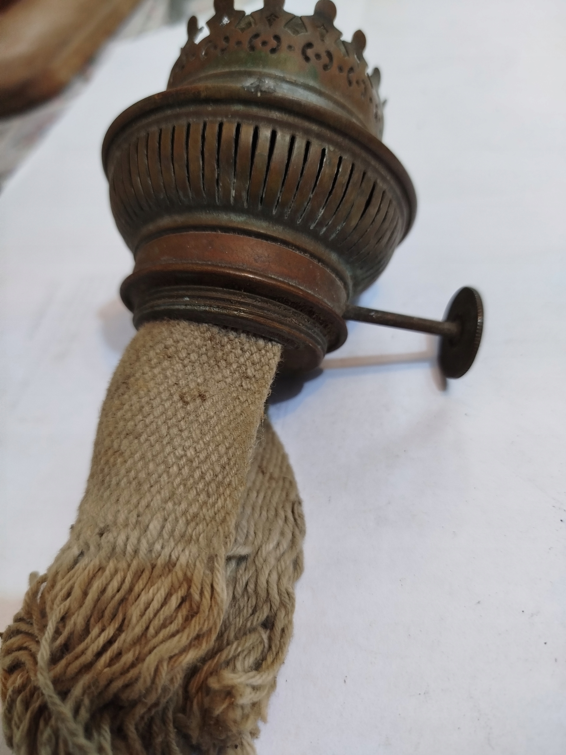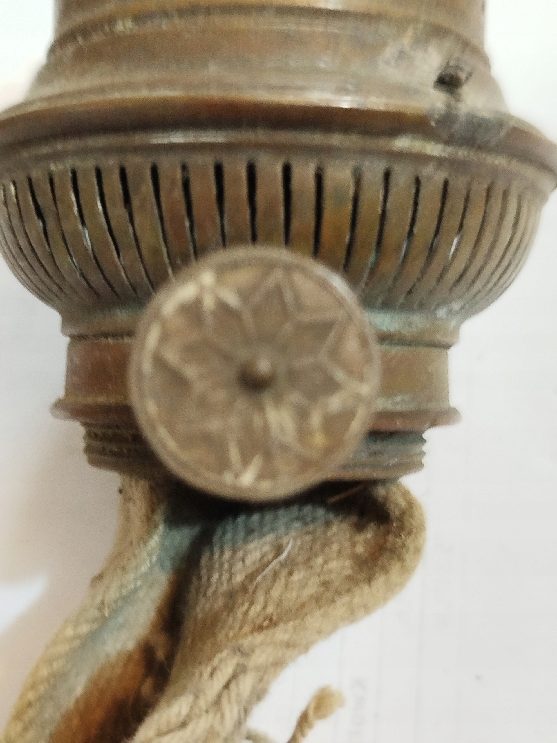 Zabytkowy angielski palnik lampy naftowej z knotem . Używany. Długość całkowita bez knota 13 cm, średnica gwintu 39,5 mm, średnica szyjki na klosz 50 mm. Wykonany z blachy mosiężnej. Z boku 3 otwory na druty podtrzymujące obręcz klosza typu umbra. Podwójny mechanizm podnoszenia klosza sprawny. Na knot o szerokości do 70x3 mm.