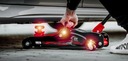 Przednie koła podnośnika są skrętne i osadzone na wznocionych wypustach, co pozwala precyzyjnie ustawić podnośnik względem podwozia i ułatwia znacząco pracę przy samochodzie.