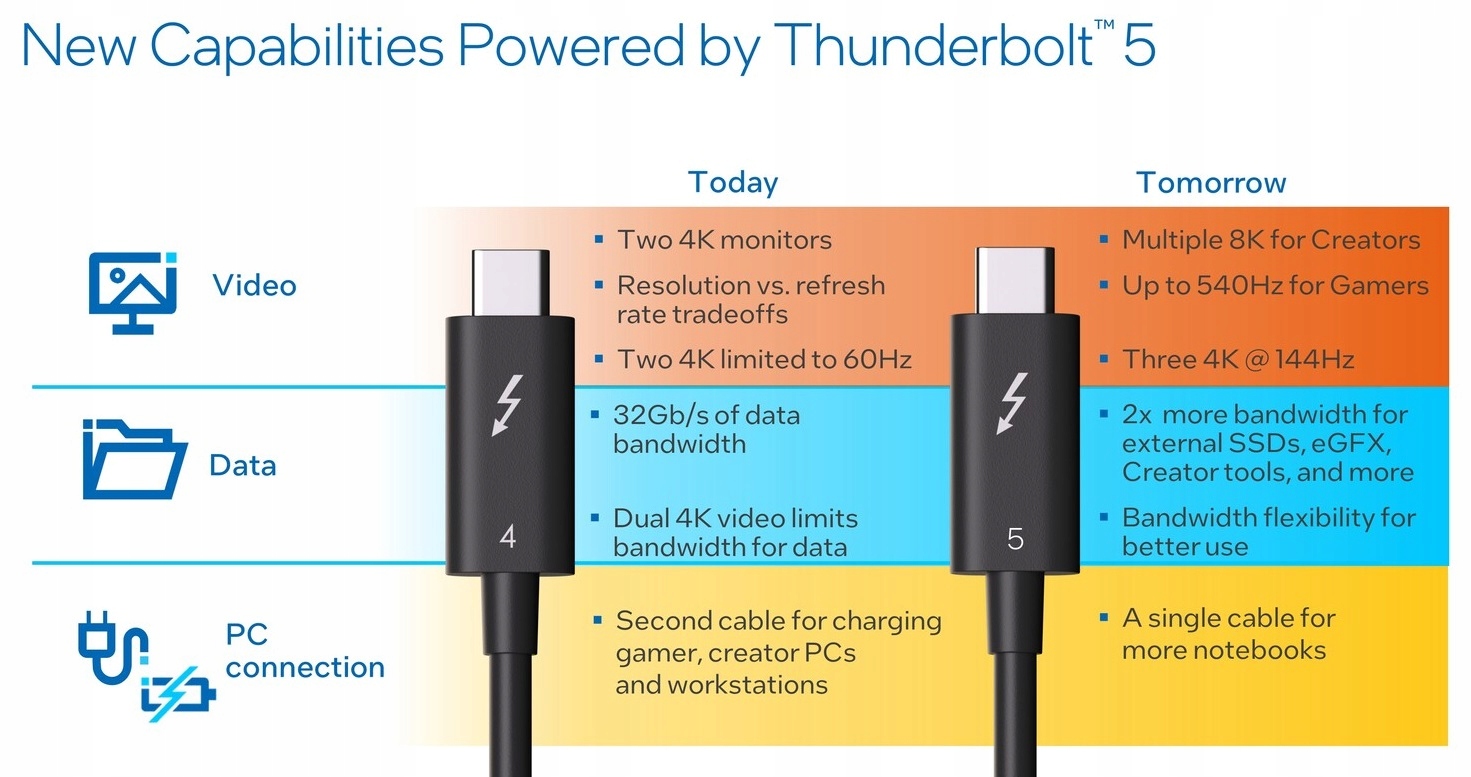 Thunderbolt 5 Cable pozwala z łatwością sprostać rosnącym wymaganiom nowoczesnych systemów komputerowych w zakresie szybkości transferu danych, wydajności wyświetlania i zasilania. Ważne jest również podłączenie wszystkich istniejących urządzeń, które mają przed sobą lata użytkowania. Dlatego też kabel Thunderbolt 5 w pełni obsługuje wszystkie niesamowite funkcje Thunderbolt 5, a jednocześnie jest w pełni kompatybilny wstecz z hostami i urządzeniami Thunderbolt 4, Thunderbolt 3, USB4 i USB-C.