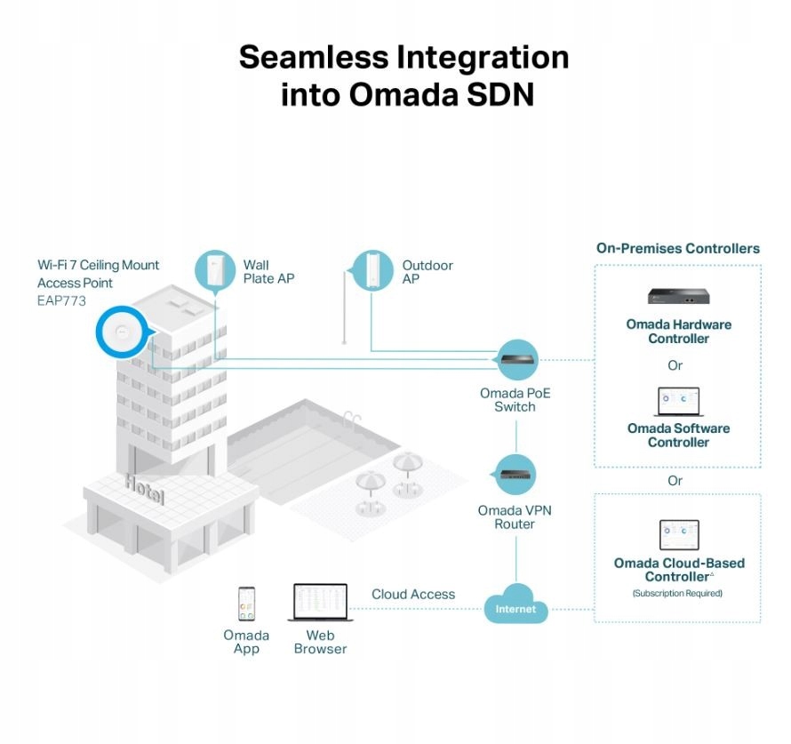 Platforma do programowego sterowania infrastrukturą sieciową (SDN) Omada integruje działanie urządzeń sieciowych, w tym punktów dostępowych, przełączników i bram sieciowych, zapewniając kompleksowe zarządzanie centralne z chmury. Omada umożliwia stworzenie wysoce skalowalnej sieci — w pełni kontrolowanej za pomocą jednego interfejsu. Przekłada się to na płynne połączenia przewodowe i bezprzewodowe, które są niezbędne w hotelarstwie, edukacji, sprzedaży detalicznej, biurach i w wielu innych branżach i miejscach.