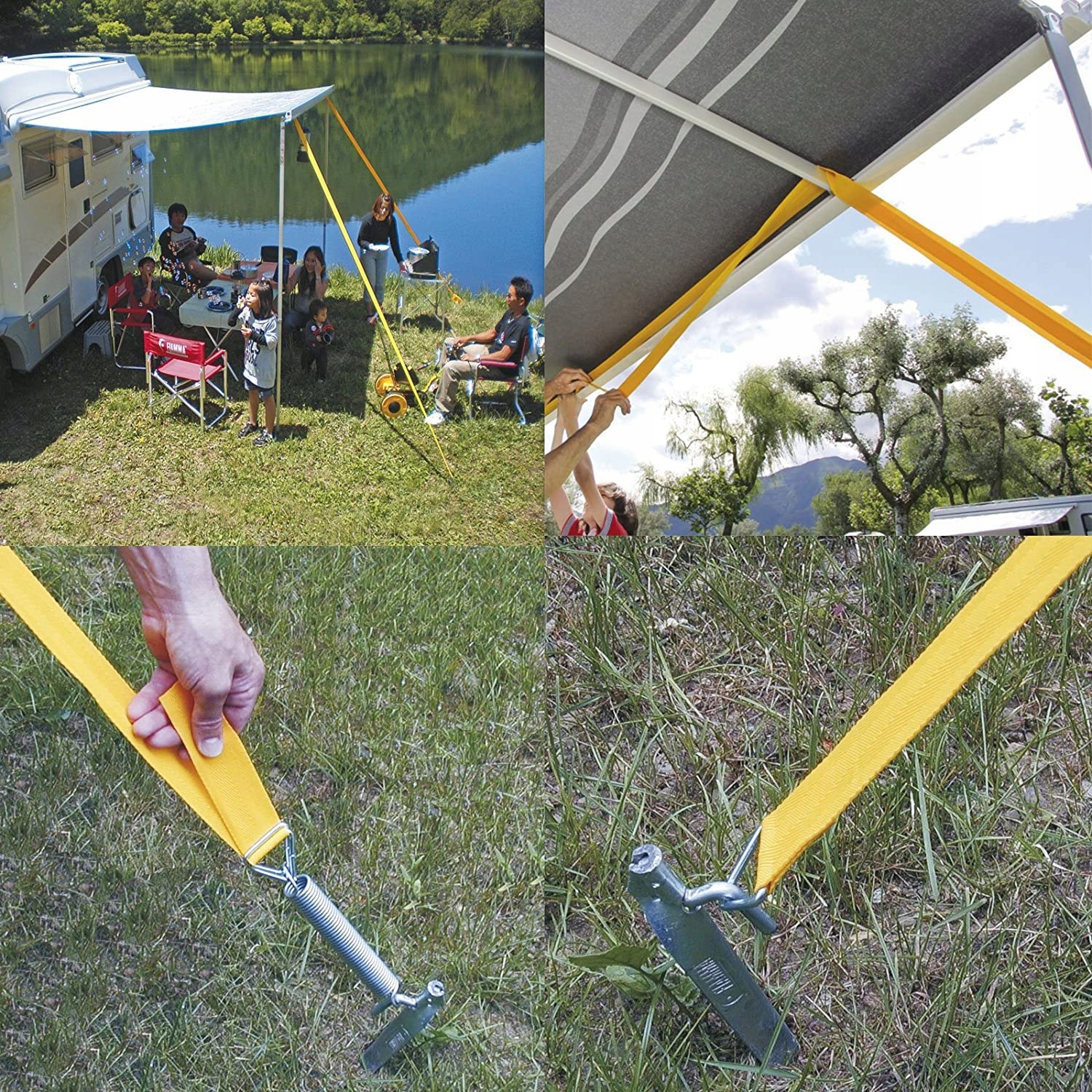 Żółte pasy sztormowe marki FIAMMA przeznaczone do modeli markiz o długości 600 cm. Stosowane są podczas silnych podmuchów wiatru aby zapobiegać zerwaniu i uszkodzeniu elementów zewnętrznych pojazdu. Pas został wykonany z polipropylenu, który jest bardzo wytrzymały na rozciąganie, zgniatanie czy ścieranie. Wykazuje również odporność na działanie wilgoci oraz promieniowania UV. Zestaw złożony jest z pasa o długości 11 m, 1 sprężyny oraz 2 stalowych śledzi.