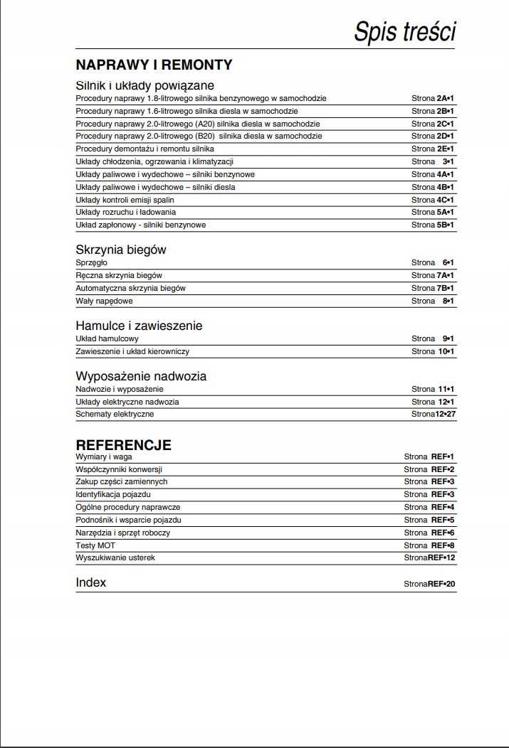 Niniejsza instrukcja obejmuje najpopularniejsze warianty - silnik benzynowy 1.8 litra, silnik wysokoprężny 1.6 litra i silniki wysokosprężne 2.0 litra. Silnik benzynowy 1.8 litra to 16-zaworowy, czterocylindrowy, rzędowy silnik DOHC (z podwójnym wałkiem rozrządu). Silnik jest sterowany przez zaawansowany system zarządzania silnikiem, który łączy wielopunktowy sekwencyjny wtrysk paliwa i bezrozdzielaczowy układ zapłonowy z kontrolą emisji par, zmienną geometrią wlotu i trójdrożnym regulowanym katalizatorem, aby zapewnić zgodność z coraz bardziej rygorystycznymi normami kontroli emisji, zapewniając jednocześnie oczekiwany poziom wydajności i oszczędności paliwa. Instrukcja zawiera rysunki i opisy pokazujące działanie różnych komponentów, dzięki czemu można zrozumieć ich układ. Następnie zadania są opisane i sfotografowane w przejrzystej sekwencji krok po kroku. Odniesienia do „lewej” lub „prawej” strony dotyczą osoby siedzącej na fotelu kierowcy, zwróconej przodem do kierunku jazdy.