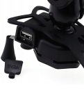 Port ładowania został zabezpieczony szczelną zaślepką, co zapewnia pełną wodoodporność, nawet w trudnych warunkach pogodowych. Uchwyt wyposażono także w praktyczny przełącznik ON/OFF, który pozwala na pełną kontrolę – po naładowaniu telefonu lub nawigacji możesz wyłączyć ładowarkę, oszczędzając energię. Dodatkowym atutem jest stylowe niebieskie podświetlenie gniazda, które z pewnością przypadnie do gustu miłośnikom nowoczesnych gadżetów.