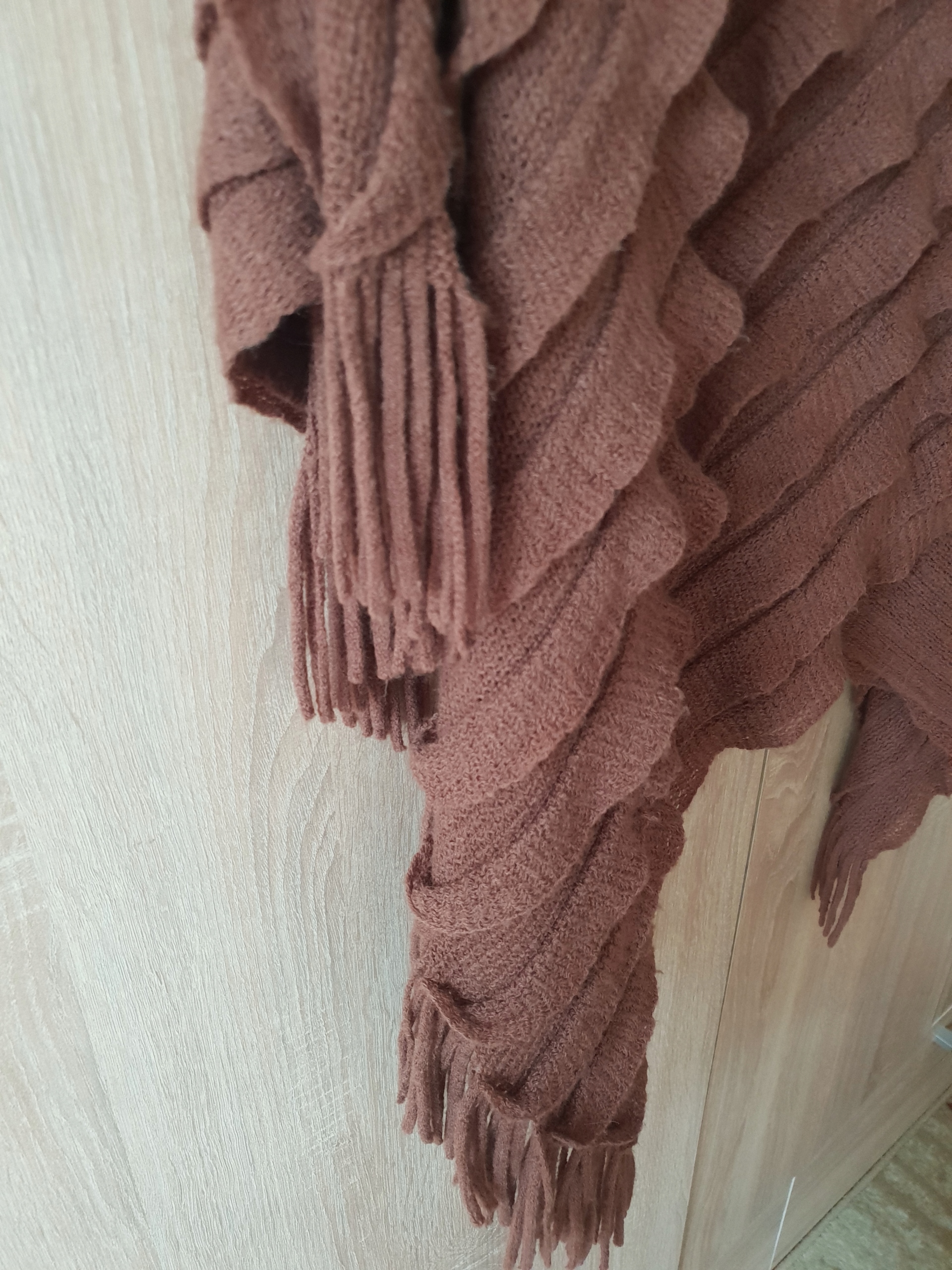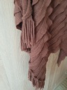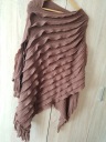 Witam i mam brązowe i lekkie ponczo w rozmiarze 44/ 46 Wykonane z miękkiego, dzianinowego materiału o unikatowym wzorze. Doskonałe dla kobiety odważnej i dodające stylu i elegancji każdej stylizacji. wkładane przez glowę . asymetryczne . szerokość w biuście 58cm x 2 .długość 106 cm w najdłuższym miejscu. cudeńko i zapraszam do zakupu bo warto go mieć.