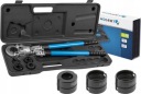 Ręczna praska do zaciskania złączek na rurach PEX-AL-PEX oraz PE-RT-AL-PE-RT. Teleskopowe rękojeści umożliwiające wydłużenie ich z 58 cm do 76 cm, zwiększając w ten sposób siłę konieczną do zakucia złączki. System szybkiej wymiany matryc pozwala w łatwy sposób wymienić matryce w zależności od potrzeb.