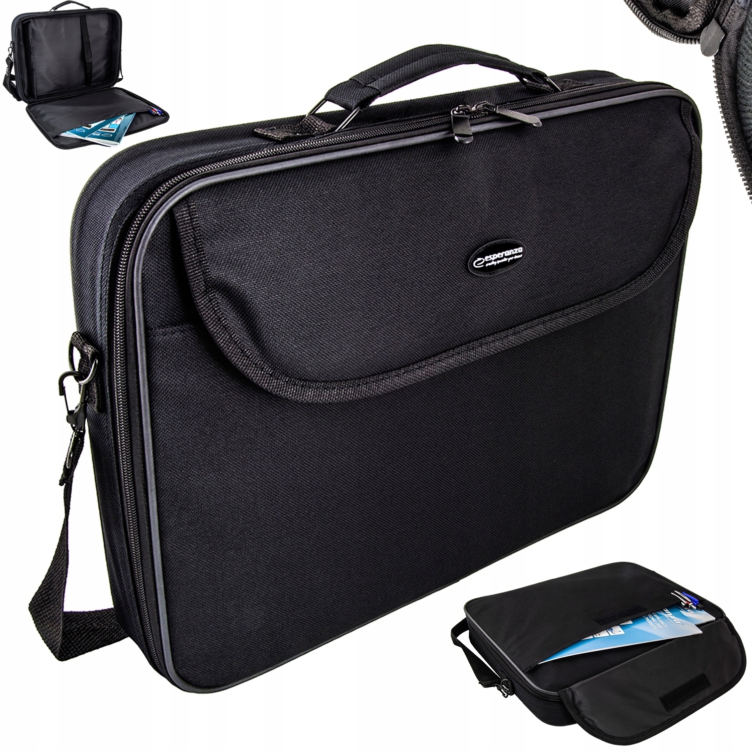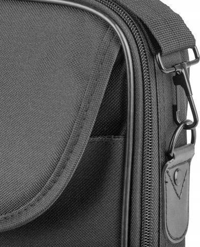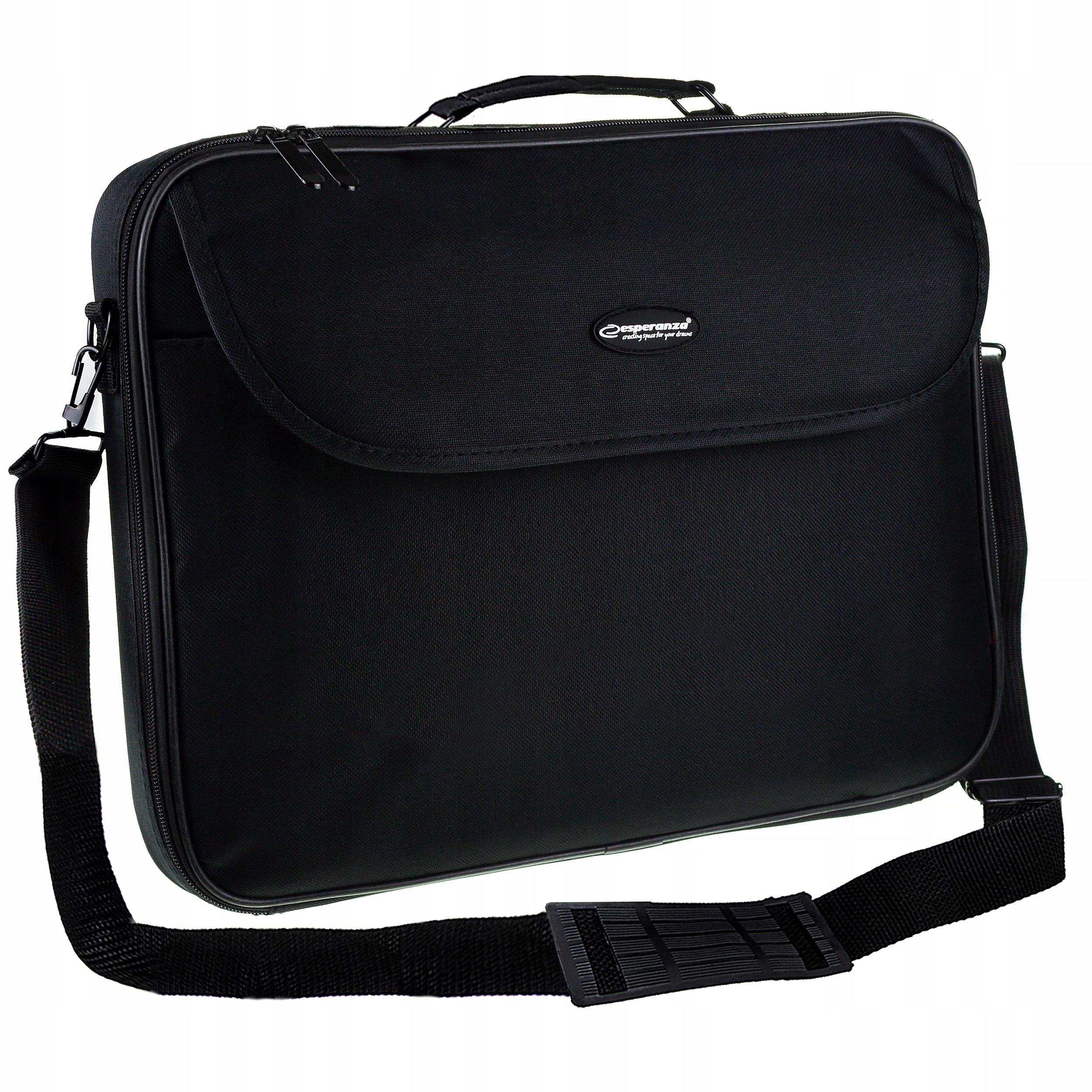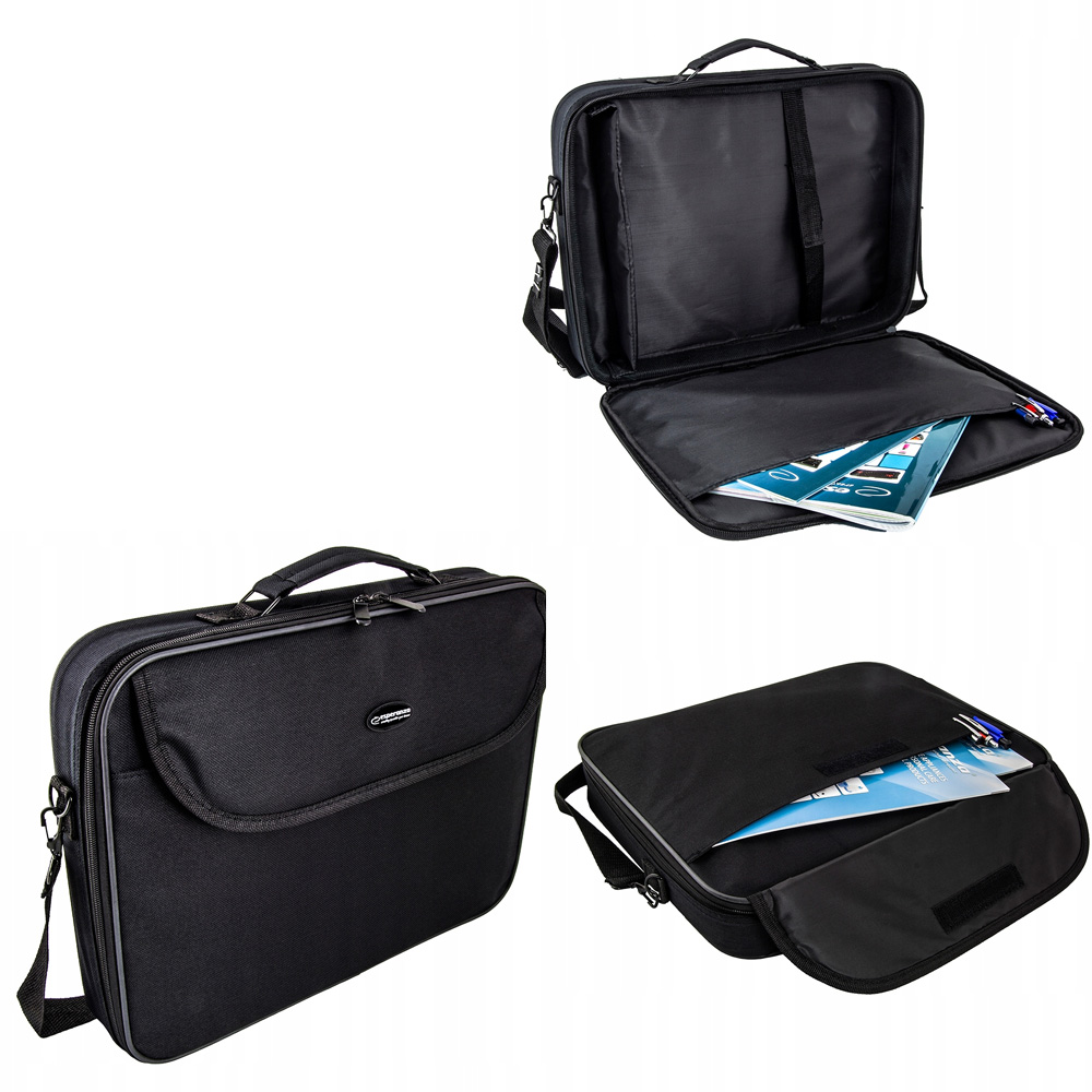 Esperanza Torba na notebooka 15,6\" ET101 Classic; Elegancka torba na laptop o wielkości 15.6” lub mniejszy (regulowana wielkość komory laptopa za pomocą przesuwnej listwy z mocowaniem na rzepach umożliwia dopasowanie do wymiarów większości notebooków). Torba wykonana jest z wysokiej jakości materiału. Ścianki boczne są wzmocnione listwą metalową, a od wewnątrz wyłożone miękką warstwą pianki skutecznie chroniącej notebook przed uderzeniami i zarysowaniami. Z przodu posiada funkcjonalną kieszeń na dokumenty. Komora notebooka z każdej strony jest wyłożona miękkimi materiałami. Wewnątrz znajduje się kieszeń na podręczne dokumenty oraz pasek dodatkowo przytrzymujący notebook. Metalowe zawiasy uchwytu i paska naramiennego gwarantują dużą wytrzymałość i niezawodność. Regulowany pasek na ramię mocowany jest za pomocą bardzo łatwych w użyciu, metalowych karabinków, a w swojej środkowej części posiada gumową nakładkę zwiększającą komfort noszenia.