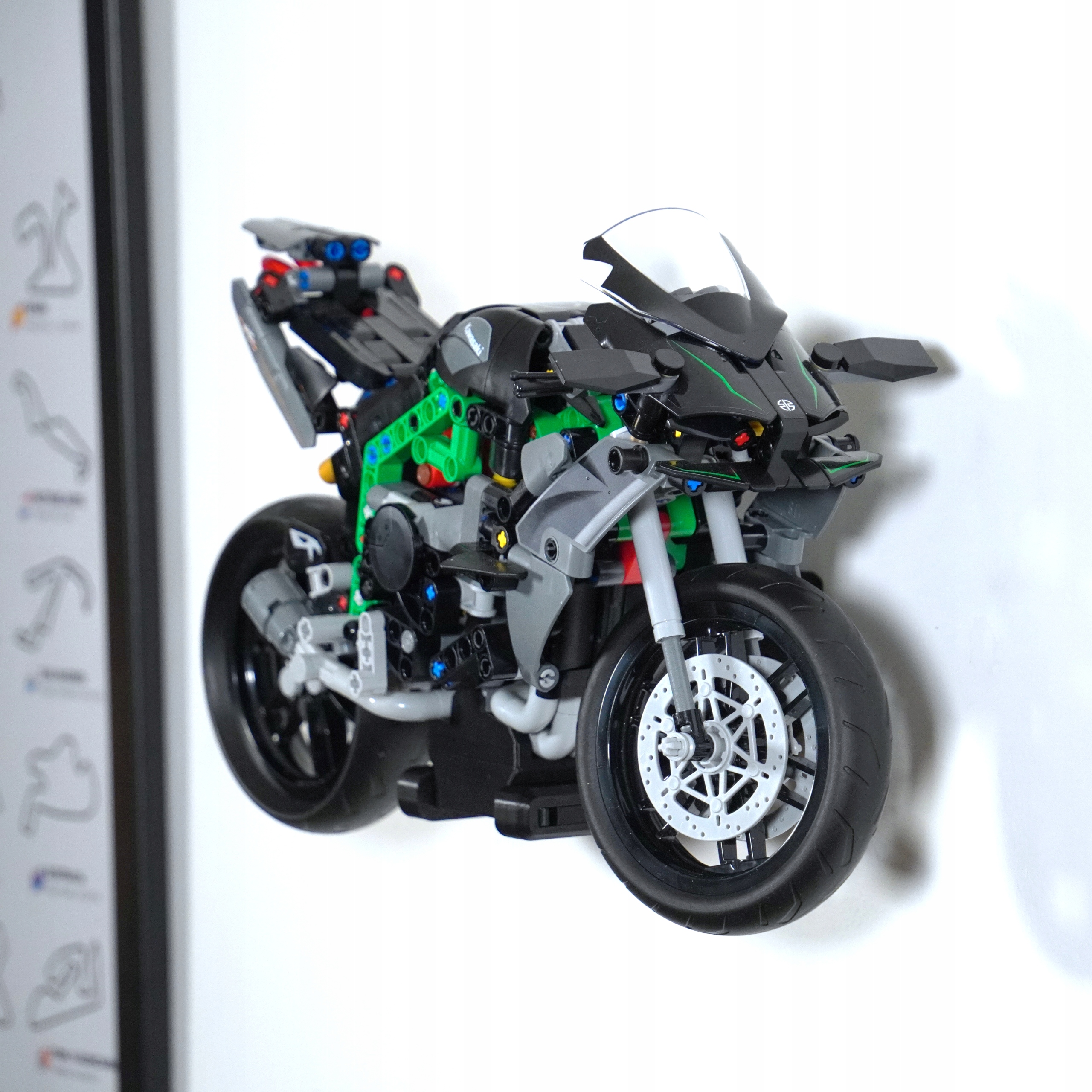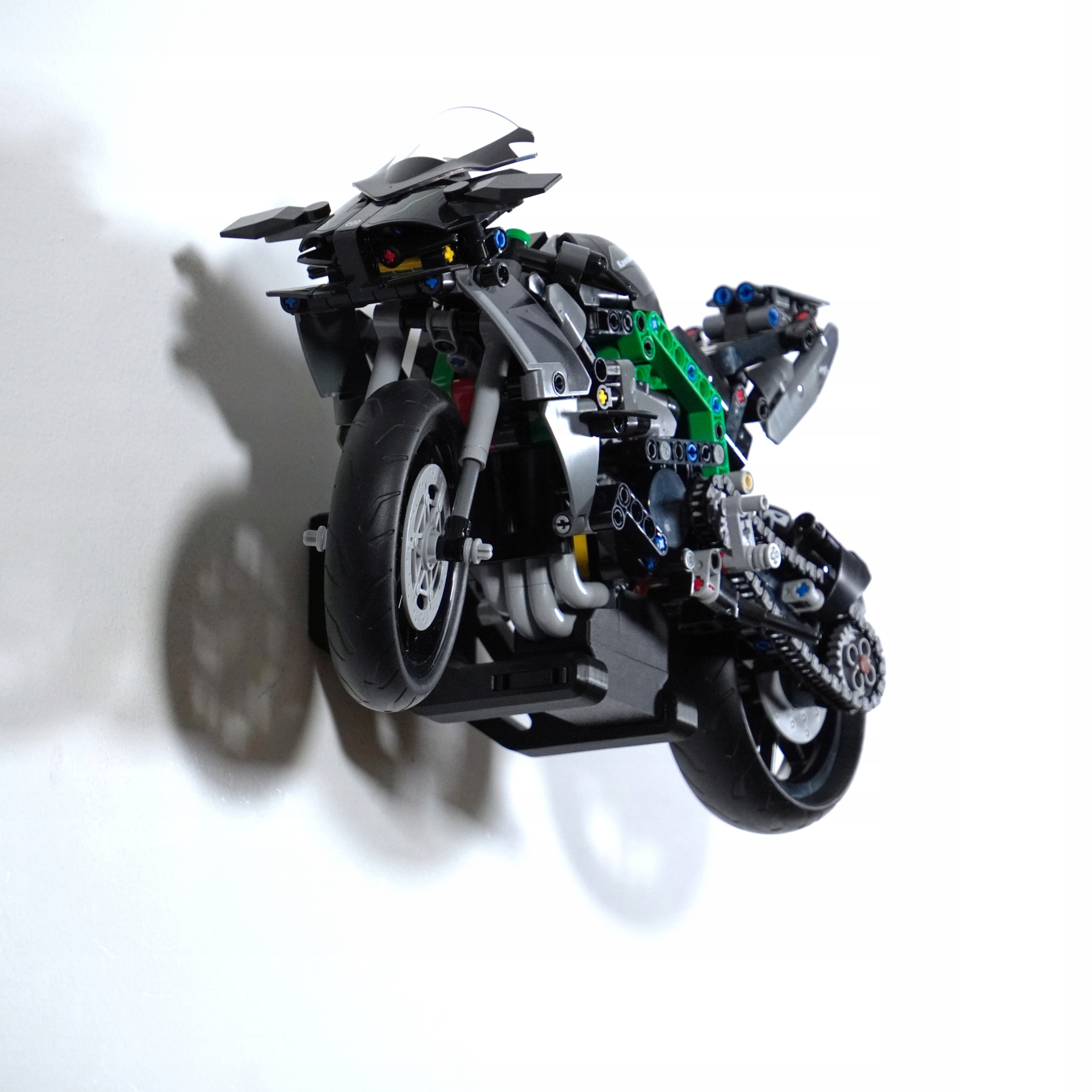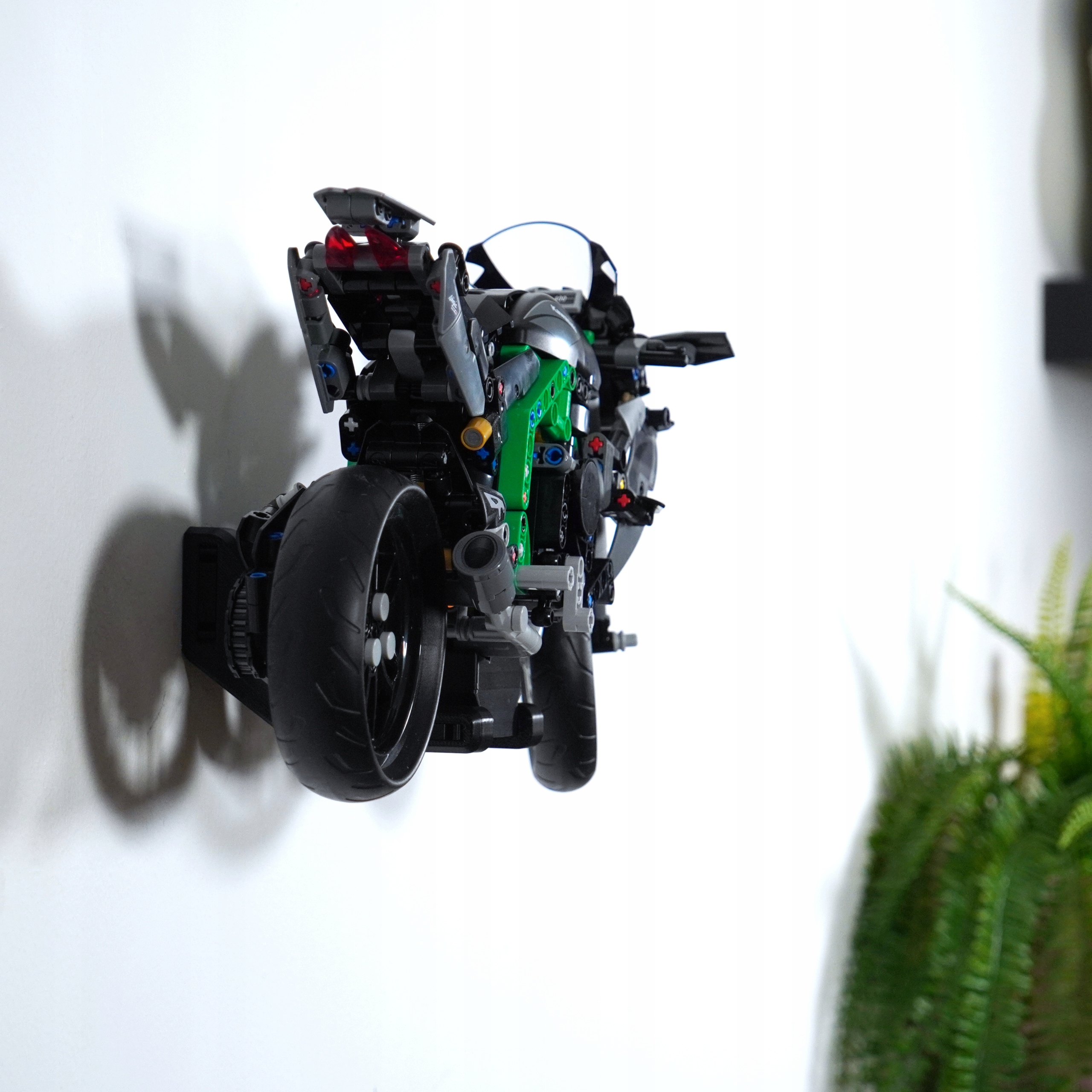 W tej konfiguracji model zawieszony jest delikatnie odchylony od ściany, co tworzy niezwykle dynamiczne wrażenie – jakby motocykl był w ruchu. To rozwiązanie szczególnie efektowne w nowoczesnych wnętrzach lub ekspozycjach kolekcjonerskich, gdzie liczy się estetyka.