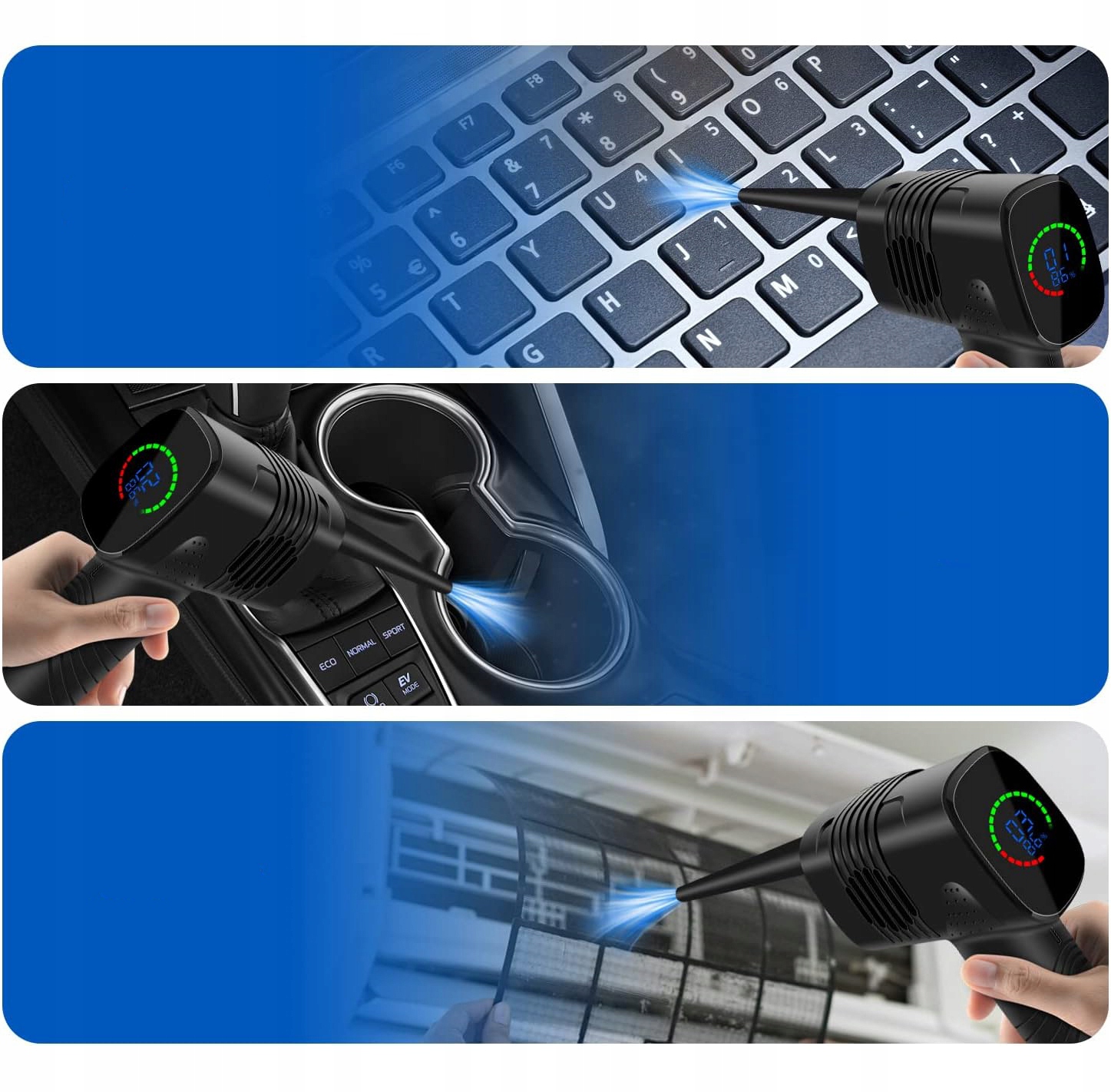 ✔️ 3 stopnie mocy nadmuchu: Urządzenie oferuje trzy poziomy mocy nadmuchu, osiągając maksymalną wartość 9 KPA. Dzięki temu, zapewnia skuteczne usuwanie zanieczyszczeń z różnych powierzchni, dostosowując siłę nadmuchu do potrzeb. Niezależnie od tego, czy chodzi o usunięcie kurzu z deski rozdzielczej, liści z tapicerki czy piasku z trudnodostępnych zakamarków, regulacja mocy pozwala na precyzyjne dostosowanie pracy urządzenia do rodzaju zabrudzenia i powierzchni.
