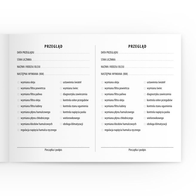 Rubryki PRZEGLĄD zawierają informacje na temat przeglądów okresowych pojazdu (10 miejsc/5 stron)