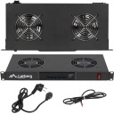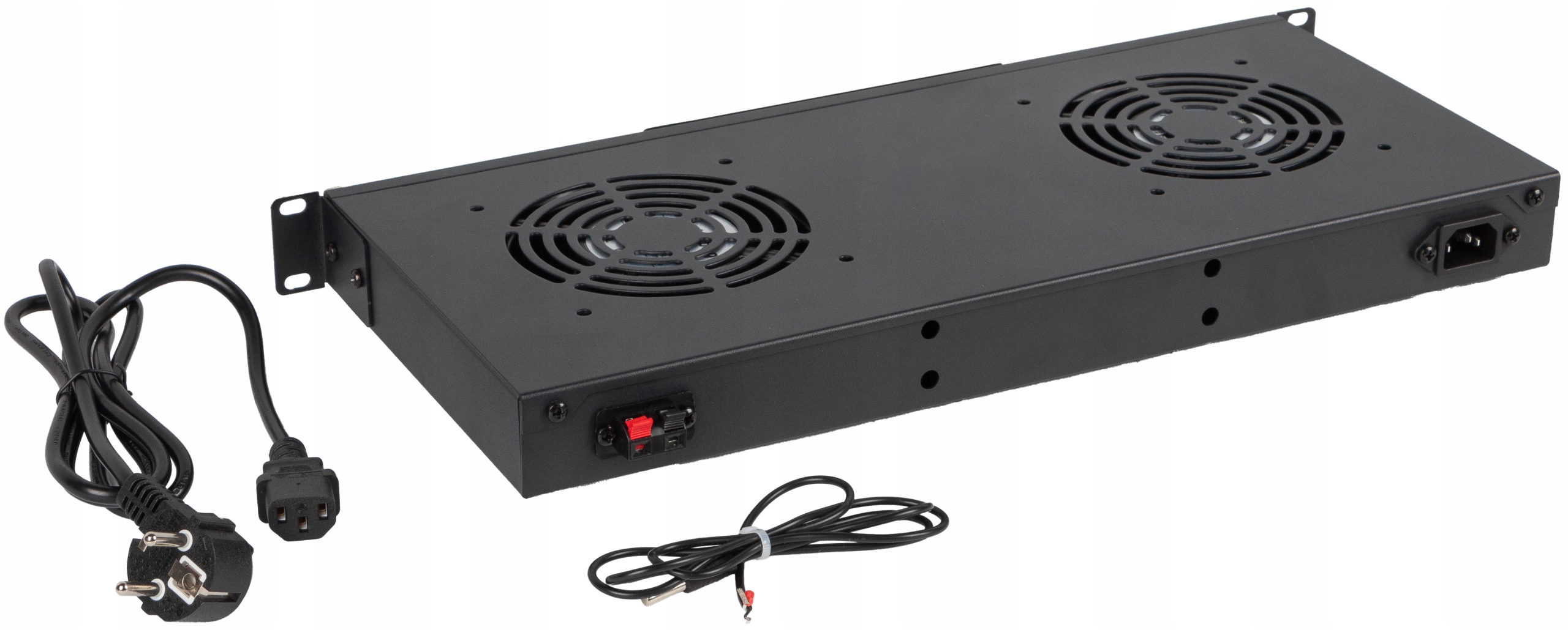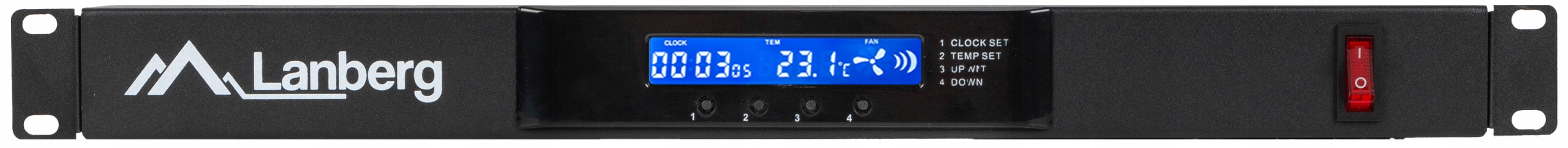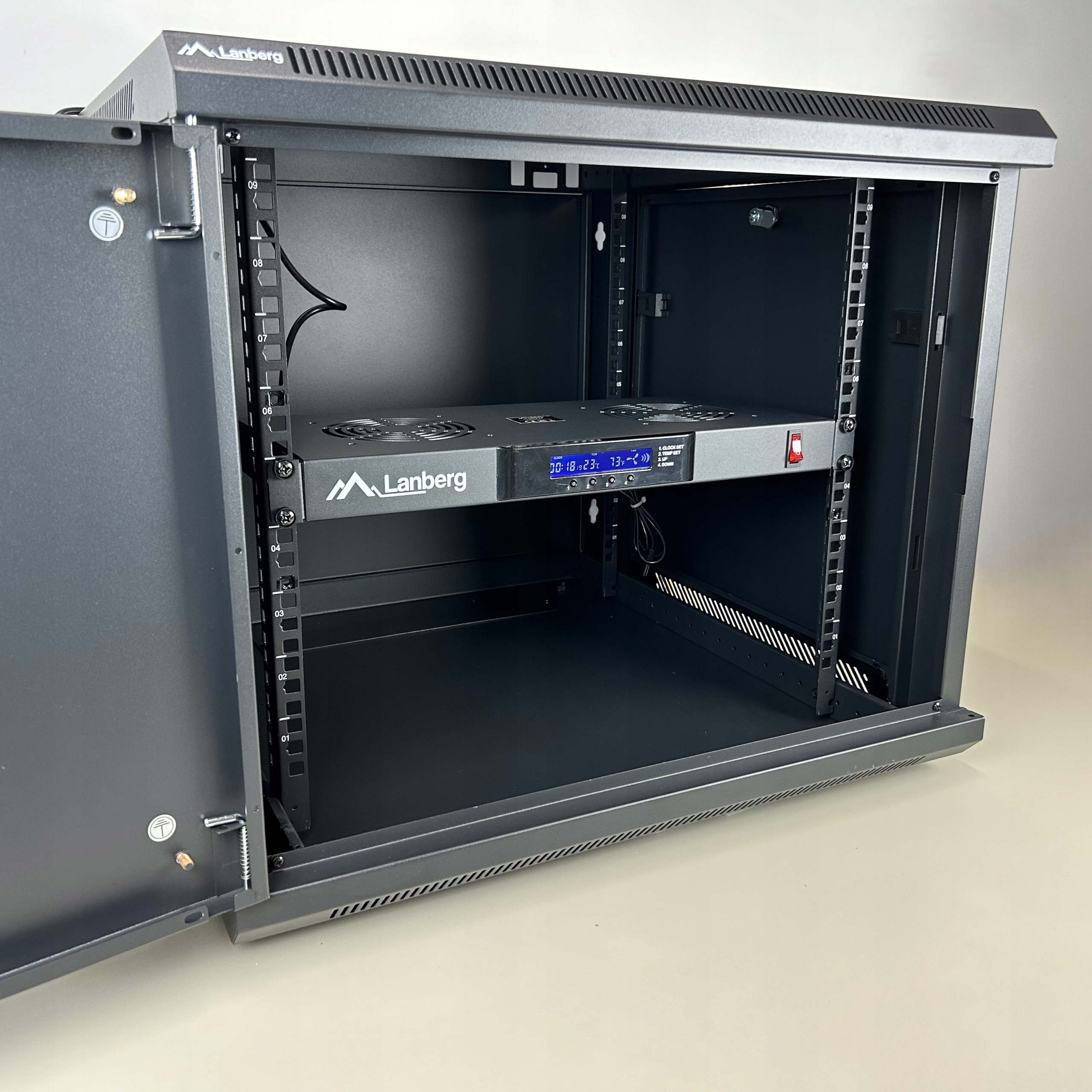 Wyposażony w dwa wentylatory o mocy 38 W, panel skutecznie rozprasza ciepło, zapobiegając przegrzewaniu się urządzeń. Wbudowany termostat automatycznie monitoruje temperaturę wewnątrz szafy i dostosowuje pracę wentylatorów, co zapewnia maksymalną wydajność oraz energooszczędność. Na przednim panelu znajduje się ekran LCD, który na bieżąco wyświetla aktualną temperaturę, umożliwiając łatwą kontrolę warunków wewnętrznych.