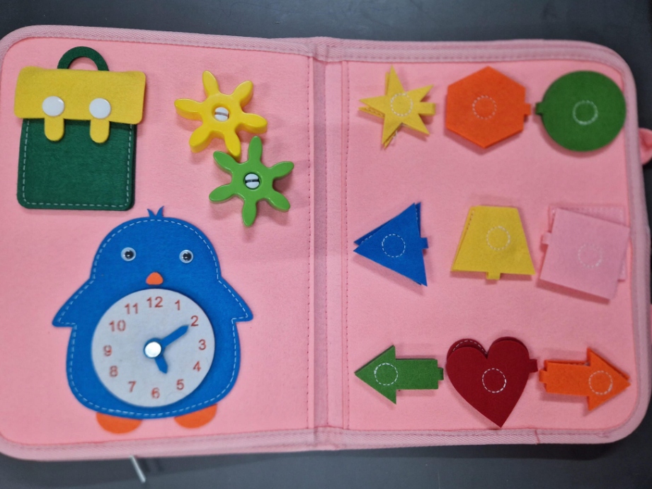 Bezpieczny materiał - zajęta deska jest wykonana z miękkiego filcu bez ostrych krawędzi, nietoksyczna i neutralna smakowo, bezpieczna dla skóry dziecka. Elastyczne klapki, nie odpadają łatwo. W połączeniu z jasnymi kolorami może poprawić koncentrację dzieci.