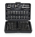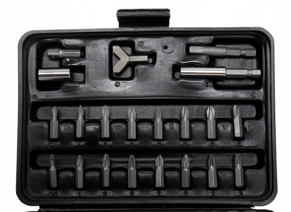 Skład zestawu: - bity (końcówki) długości 25mm, - końcówka motylkowa 20 mm, - przejściówka - redukcja sześciobok ¼" / kwadrat ¼" długości 25 mm (do grzechotki ¼"), - przejściówka - redukcja kwadrat ¼” / sześciobok ¼” 2 szt długości 25mm i 50mm (do uchwytu śrubokręta lub wkrętarki), - uchwyt magnetyczny do bitów długości 60 mm, - BITY płaskie 9 szt: 3 - 4- 4,5 - 5 - 5,5 - 6 - 6,5 - 7 - 8mm, - BTY krzyżowe PH 8 szt: 0 - 1 - 2 x 5szt. - 3, - BITY krzyżowe PZ 8 szt: 0 - 1 - 2 x 5 szt. - 3, - BITY imbusowe metryczne 9 szt: 1,5 - 2 - 2,5 - 3 - 4 - 5 - 5,5 - 6 - 8 mm, - BITY imbusowe metryczne z otworami 6szt: 2 - 2,5 - 3 - 4 - 5 - 6mm, - BITY imbusowe calowe 10 szt: 1/16" - 5/64" - 3/32" - 7/64" - 1/8" - 6/64" - 5/32" - 3/16" - 7/32 - 1/4", - BITY imbusowe calowe z otworami 6szt: 5/64" - 3/32" - 7/64" - 1/8" - 9/64" - 5/32", - BITY TORX 9szt: T8 - T10 - T15 - T20, T25 - T27 - T30 - T40 - T45, - BITY TORX z otworami 8szt: T8 - T10 - T15 - T20 - T25 - T30 - T40 - T45, - BITY typu gwiazda 4 szt nr: 1 - 2 - 3 - 4, - BITY krzyżowe niesymetryczne Gr 3szt: 6 - 8 - 10, - BITY kwadratowe R 4 szt: 0 - 1 - 2 - 3, - BITY "widełki" serwisowe 4 szt: nr 4 - 6 - 8 – 10, - BITY SPLINE 3 szt: 5 - 6 - 8, - BITY serwisowe typ C 3 szt: 1 - 2 - 3. - Walizka