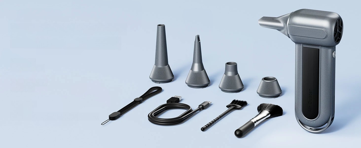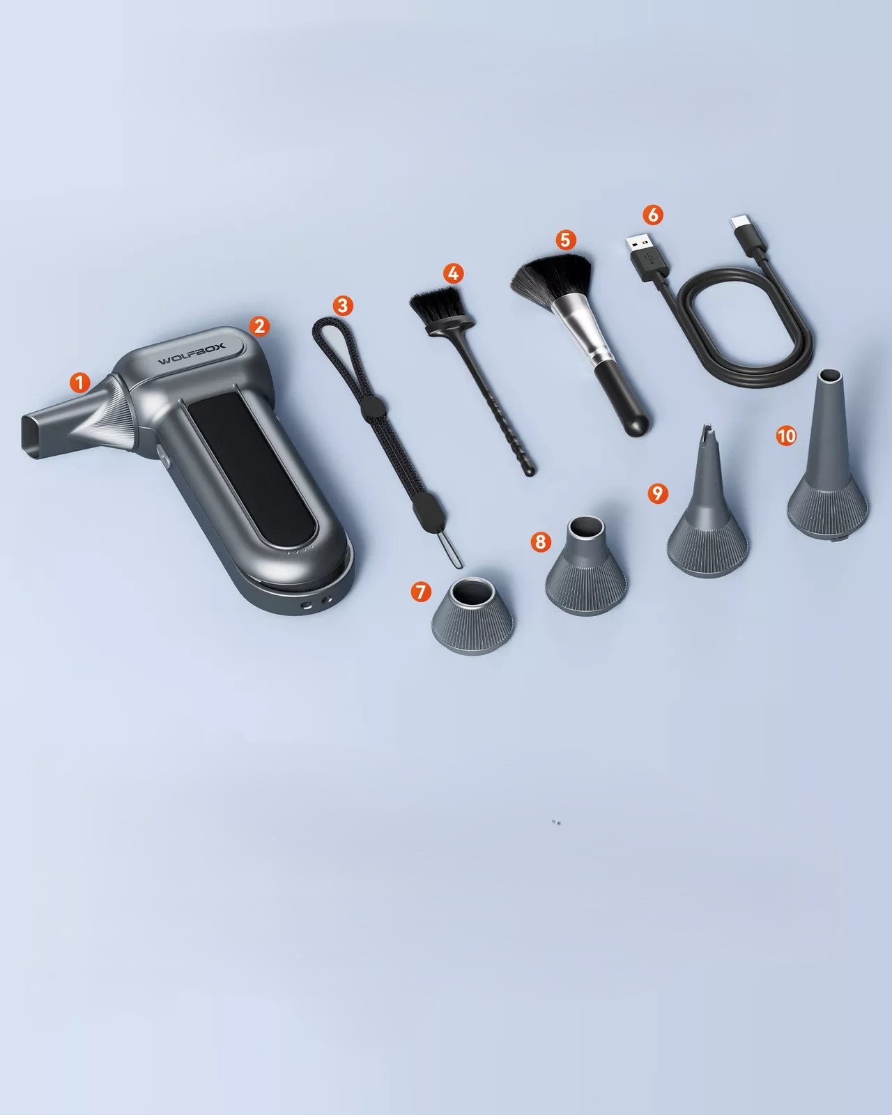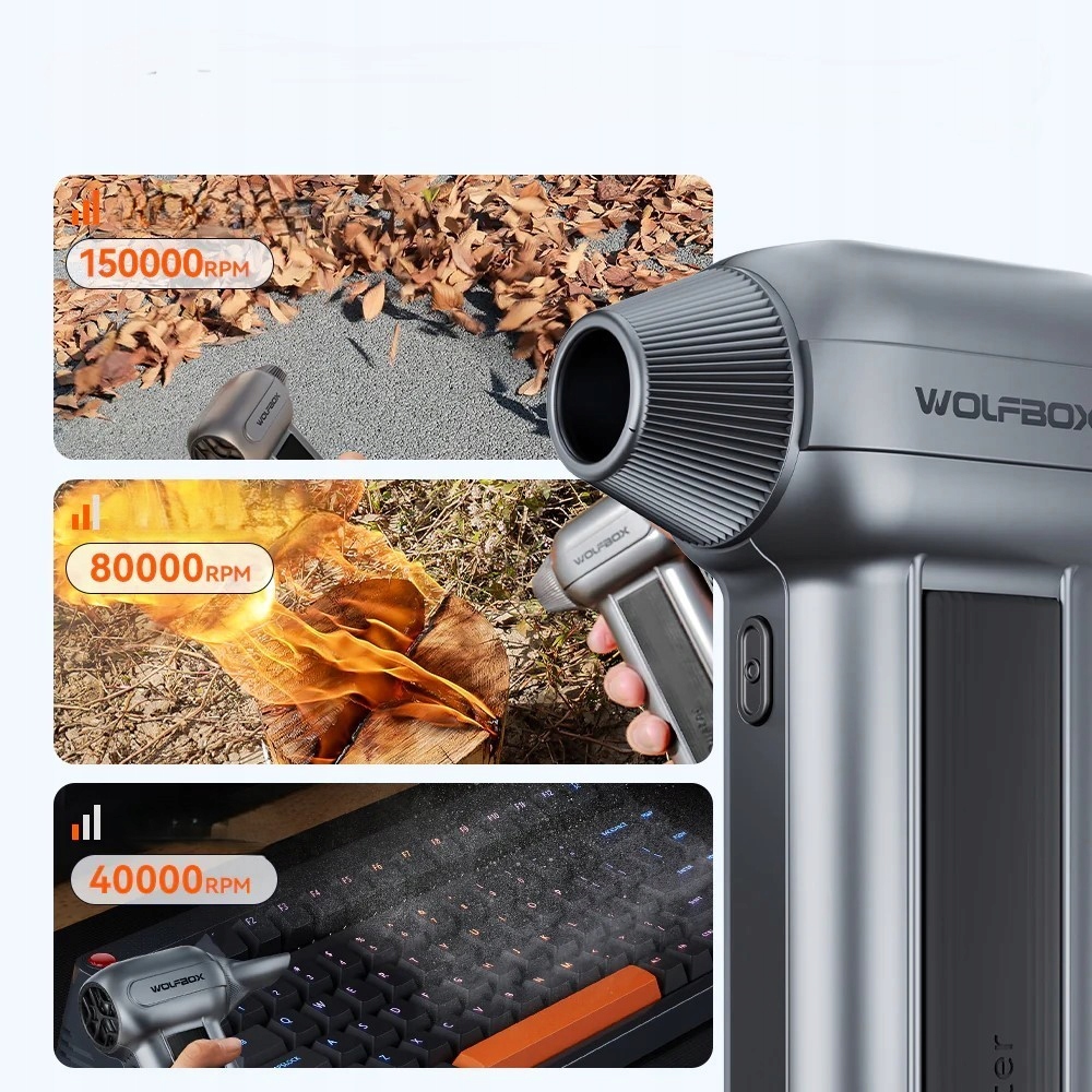 WOLFBOX MF100 to wysokowydajna, bezprzewodowa dmuchawa sprężonego powietrza, idealna do różnorodnych zastosowań, takich jak czyszczenie komputera, klawiatury czy sprzętu elektronicznego. Dzięki potężnemu silnikowi o prędkości 150000 RPM i regulowanej mocy, oferuje wyjątkową wydajność w kompaktowej formie.