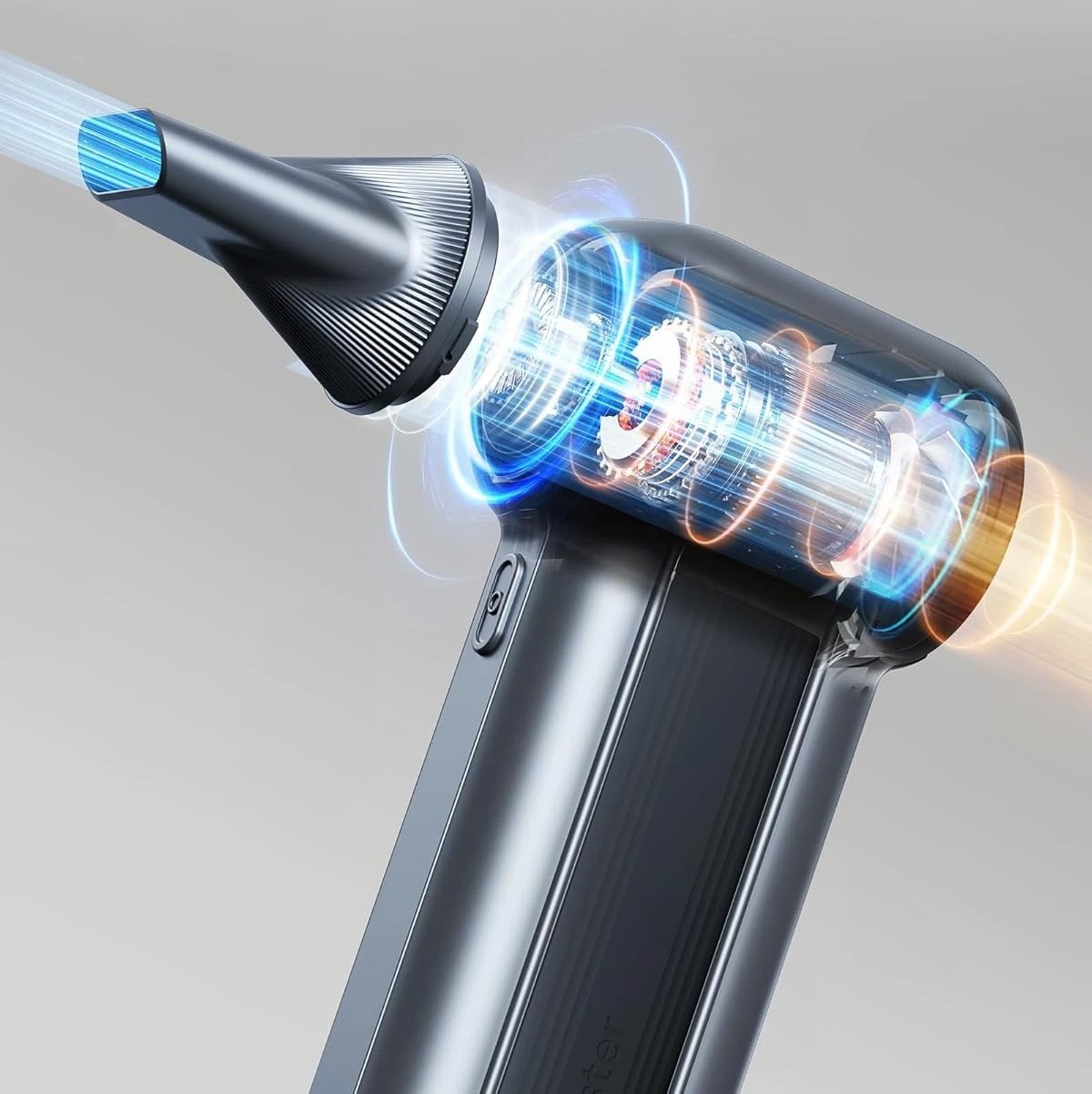Super mocny silnik: Prędkość obrotowa 150000 RPM generuje przepływ powietrza o prędkości ponad 45 m/s, co pozwala na skuteczne usuwanie nawet najtrudniejszych zanieczyszczeń.