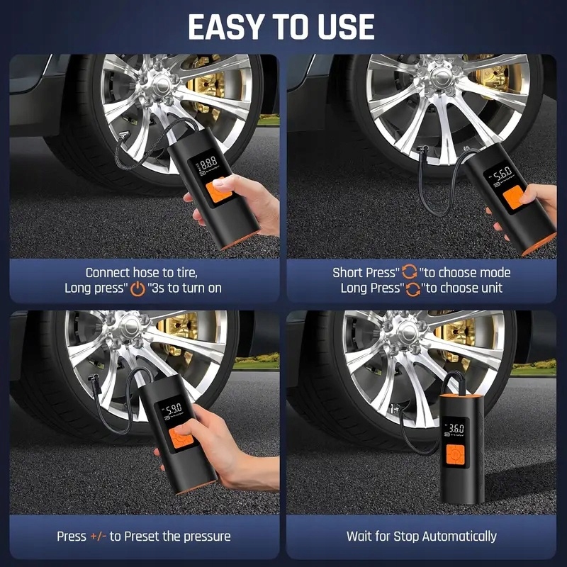 Pompa do opon przenośna sprężarka powietrza-4 wstępnie ustawione tryby inflacji nadmuchują samochody, motocykle, rowery i piłki. Piąty tryb niestandardowy może również ustawiać wartości ciśnienia w oparciu o obiekt inflacji, 4 różne ciśnienia łączy wybory: PSI, KPA, BAR i KG/CM², spełniając różne potrzeby inflacyjne. Również po osiągnięciu prawidłowego ciśnienia wpychacz opon automatycznie się wyłączy, co ułatwi początkującym korzystanie.