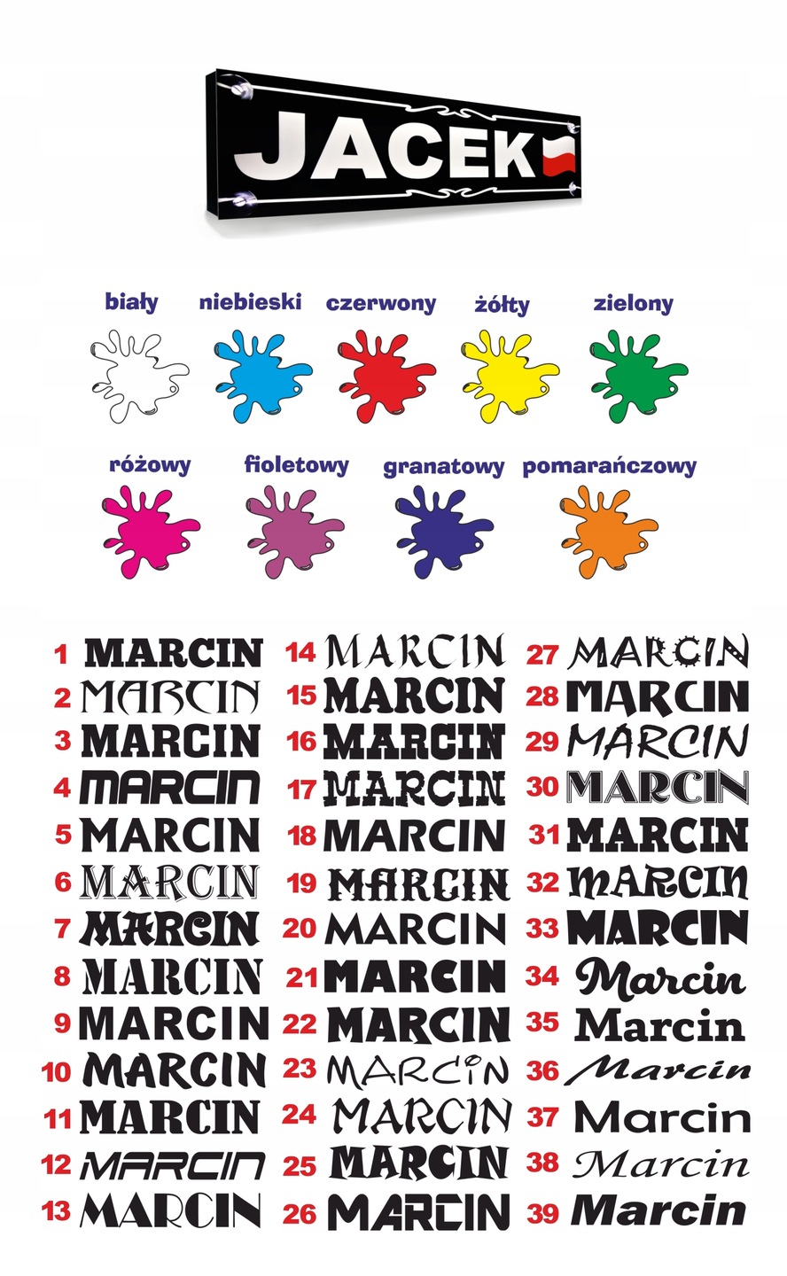 Na poniższych grafikach znajdziesz loga i czcionki do wyboru, jak również pełną paletę kolorów, które możemy zastosować na Twojej tablicy LED.