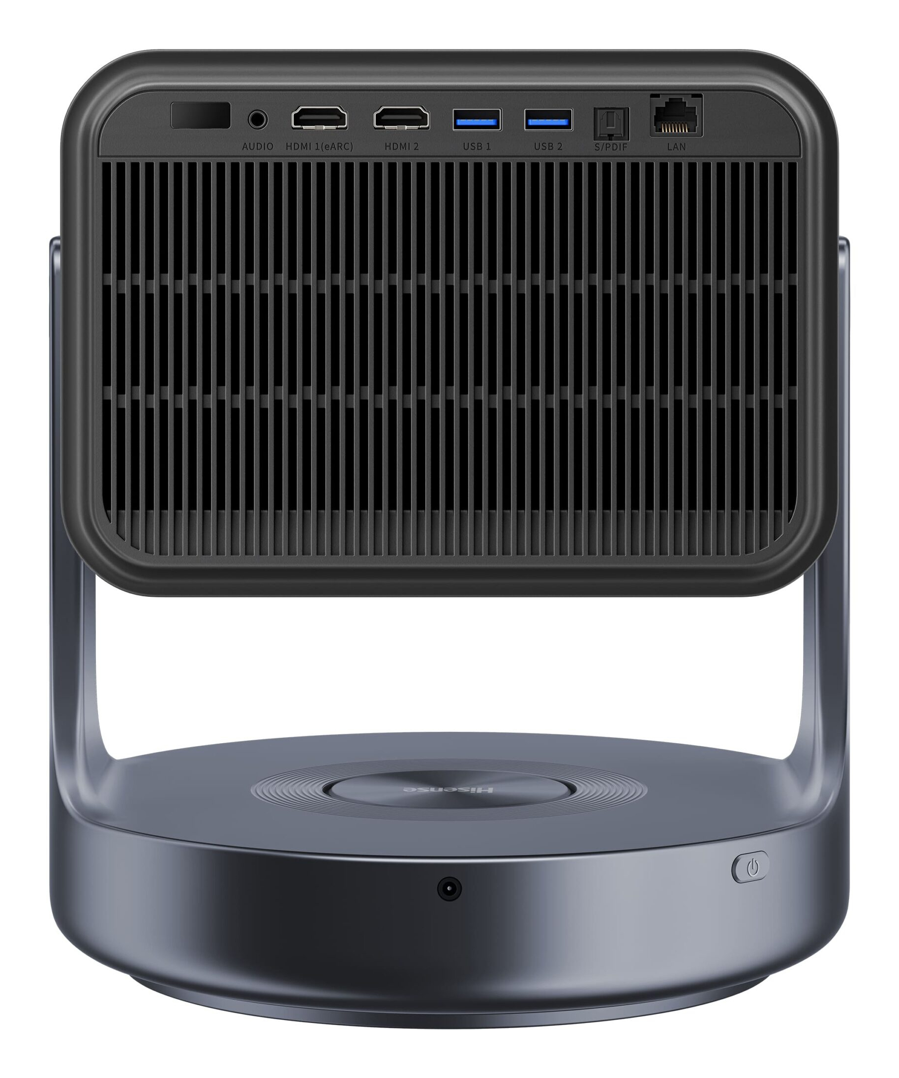 Hisense C2 Ultra wyróżnia się stylowym wzornictwem łączącym wydajność projekcji z estetyką. Dzięki regulowanej podstawie, która umożliwia obrót o 360° i pochylenie do przodu lub do tyłu, harmonijnie wpasowuje się w każde otoczenie. Jego wytrzymała i elegancka metalowa obudowa spoczywa na okrągłej podstawie, w której mieści się subwoofer zapewniający wciągający dźwięk.