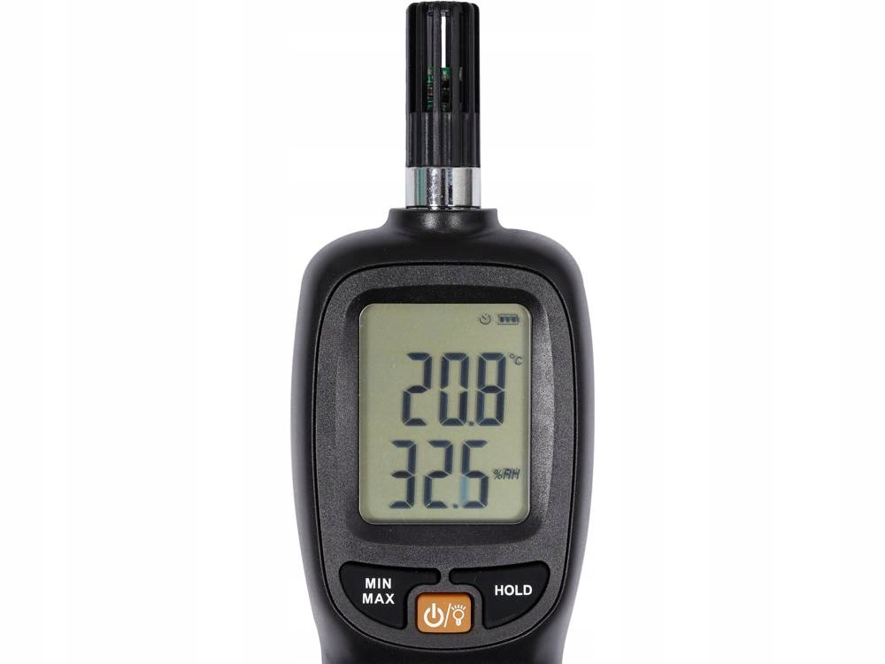 Miernik wilgotności i temperatury (higrometr), to urządzenie do rejestrowania poziomu wilgotności względnej i temperatury otoczenia. Zaawansowany czujnik wykonuje minimum 65 pomiarów na sekundę. Mikroprocesor odbiera sygnały z pomiarów, przetwarza je na wartość średnią i wyświetla na ekranie z aktualizacją co pół sekundy. Przenośny higrometr znajduje szerokie zastosowanie w codziennych pracach. Wykorzystuje się go do kontroli parametrów w produkcji rolnej, hodowli zwierząt, w systemach wentylacji, terrariach itp.