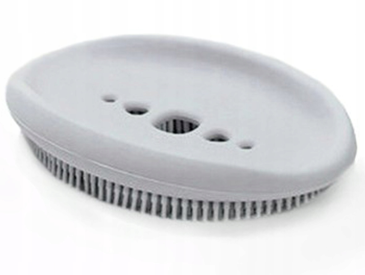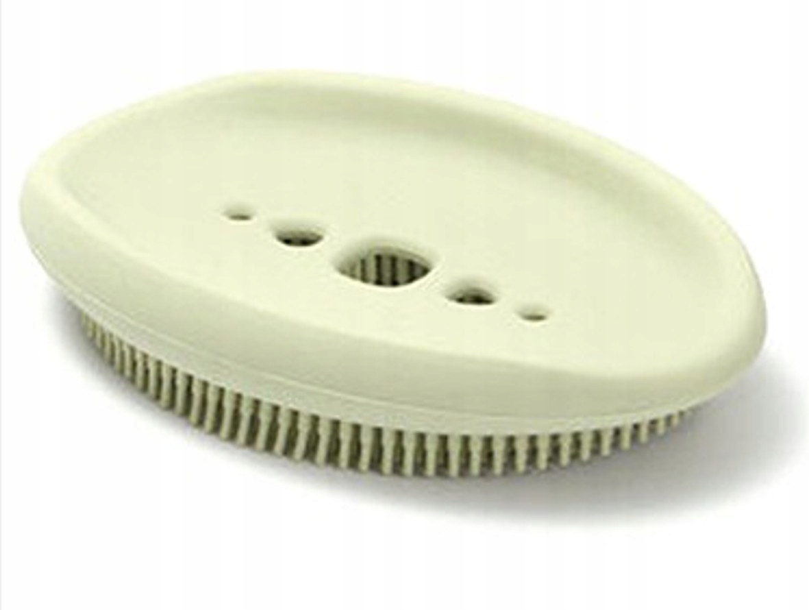 Spód mydelniczki wyposażony w miękkie, silikonowe włosie dzięki czemu może służyć również jako szczotka!