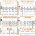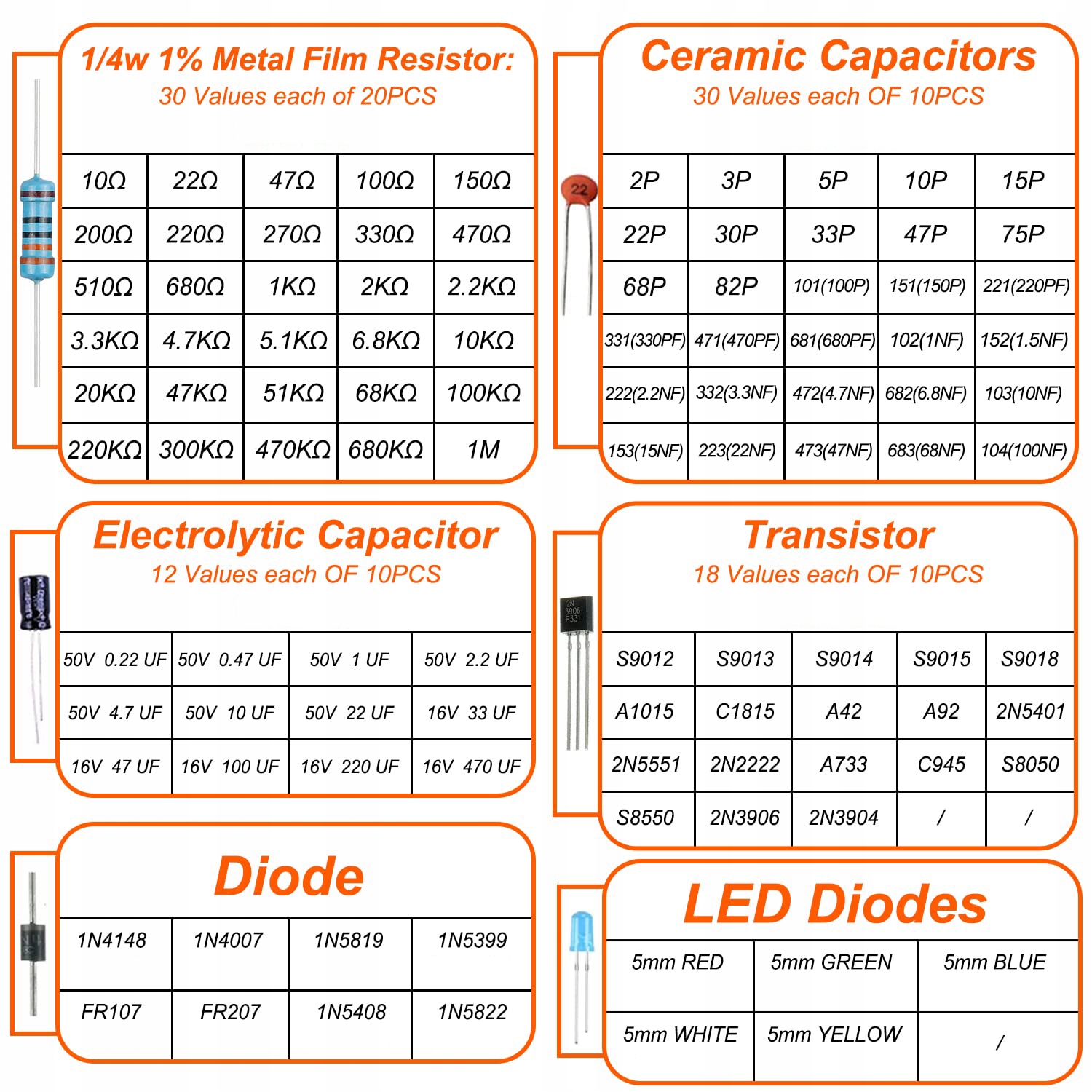 12 rodzajów kondensatorów elektrolitycznych, 30 rodzajów kondensatorów ceramicznych, 8 rodzajów zwykłych diod, 5 rodzajów diod LED, 8 rodzajów tranzystorów, 30 rodzajów rezystancji folii metalowej. Każdy rodzaj jest zapakowany w plastikową torbę.