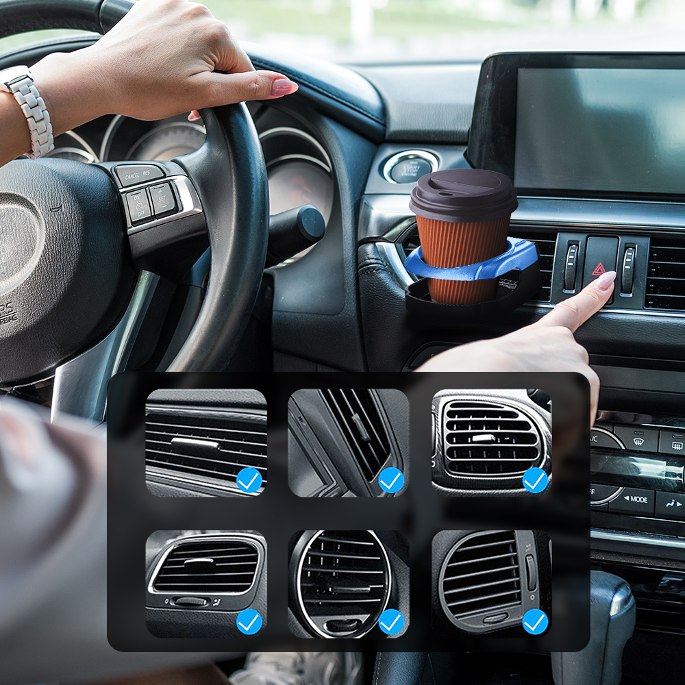 ✔️ Produkt mocowany jest na kratkę wentylacyjną, co zapewnia łatwy dostęp do napoju i wygodę podczas jazdy. Teraz możesz mieć swoją kawę czy wodę zawsze pod ręką, bez ryzyka rozlania.