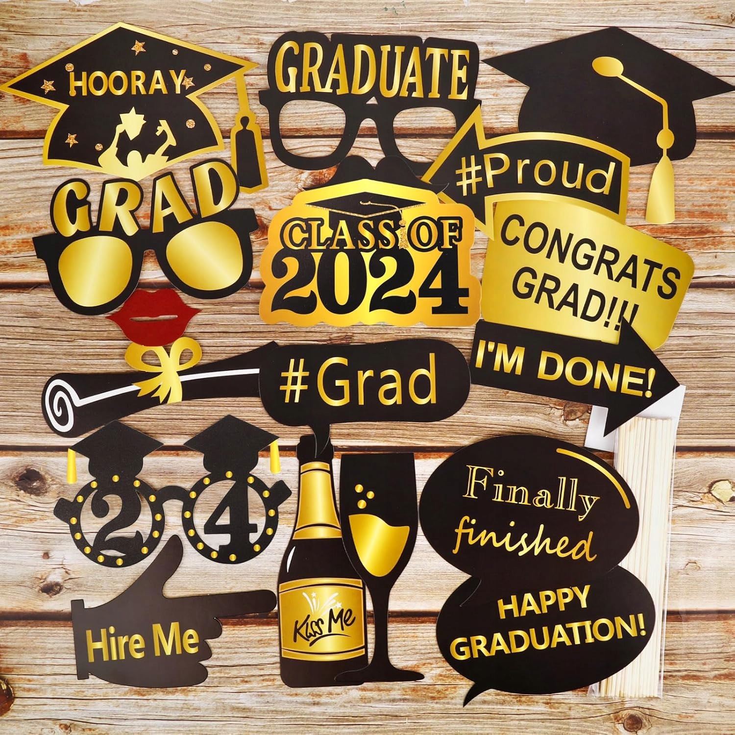 Dekoracje na zakończenie szkoły 2024: Wystarczy przymocować dołączone kołki bambusowe do każdego rekwizytu do zdjęcia z zakończenia szkoły za pomocą kleju z perłowymi koralikami, a następnie trzymać rekwizyt przed twarzą, nad głową itd. Zrób zdjęcie, jakie chcesz, w dowolnym czasie i miejscu, stwórz wspomnienie ze swoją klasą po zakończeniu ceremonii ukończenia szkoły.