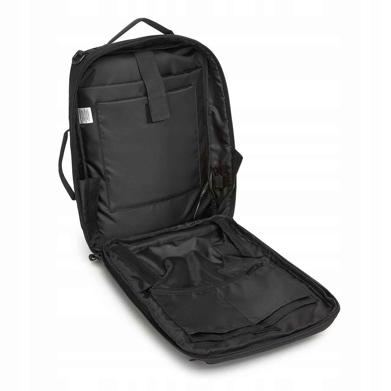 Port USB umieszczony z boku plecaka pozwala na szybkie i wygodne podłączenie powerbanka, dzięki czemu możesz ładować swoje urządzenia bez wyjmowania ich z torby.