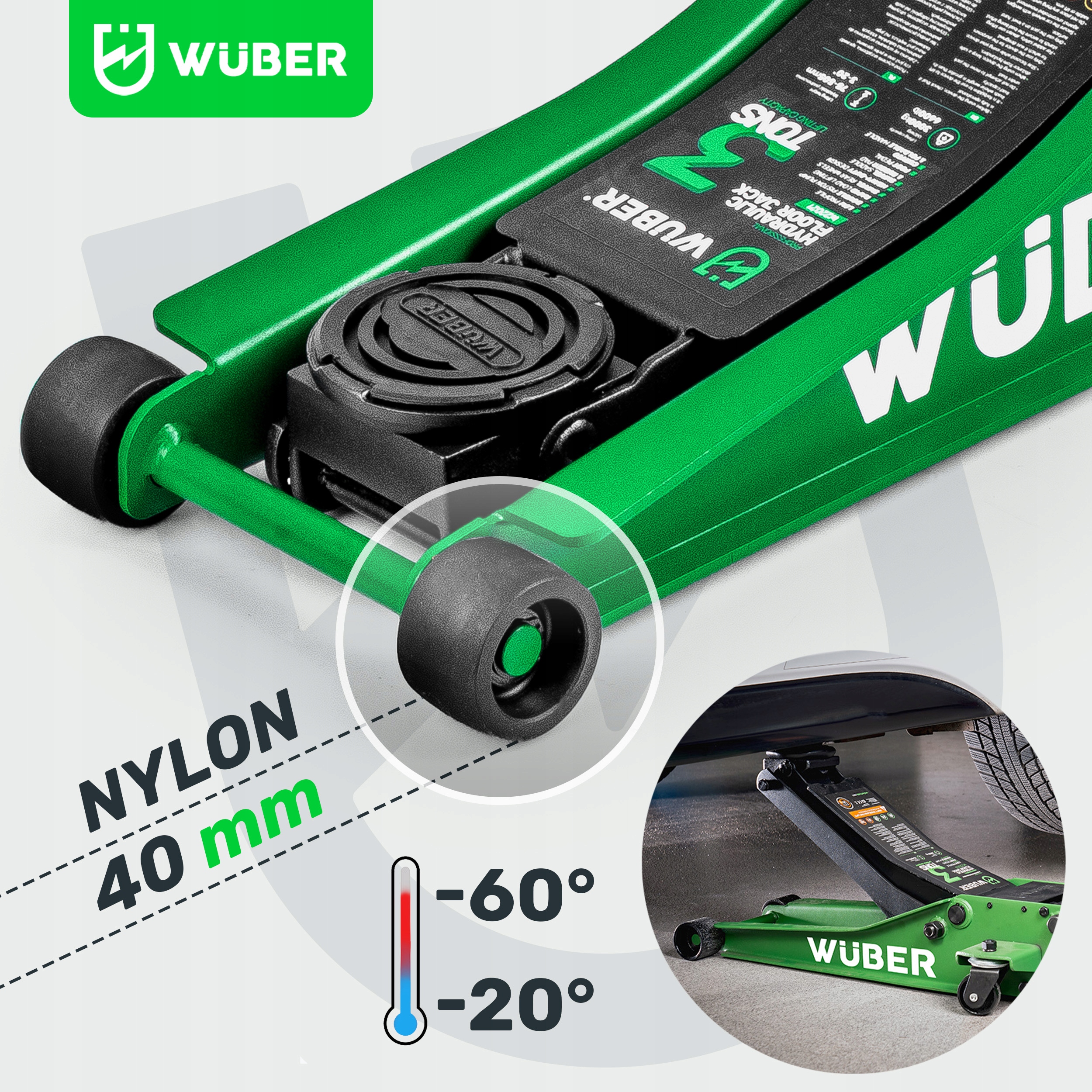 ✅ Szerokie NYLONOWE koła ► Koła z wytrzymałego nylonu zapewniają płynne przemieszczanie podnośnika po różnych nawierzchniach, chroniąc przy tym posadzkę przed zarysowaniami