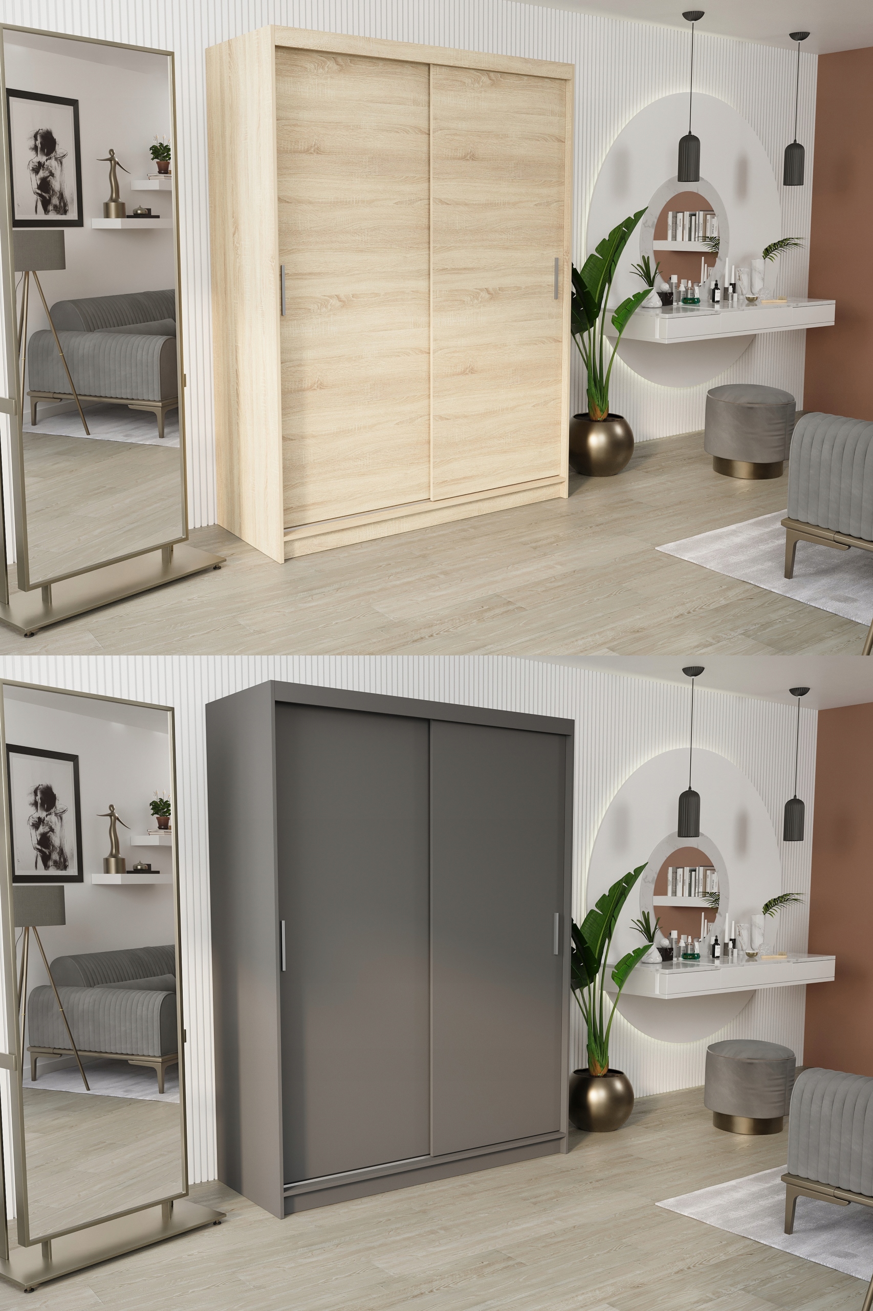 Szukasz stylowej i praktycznej szafy do swojej sypialni, przedpokoju lub garderoby? Szafa przesuwna o szerokości 150 cm to idealne rozwiązanie, które łączy elegancki design z wygodą użytkowania.