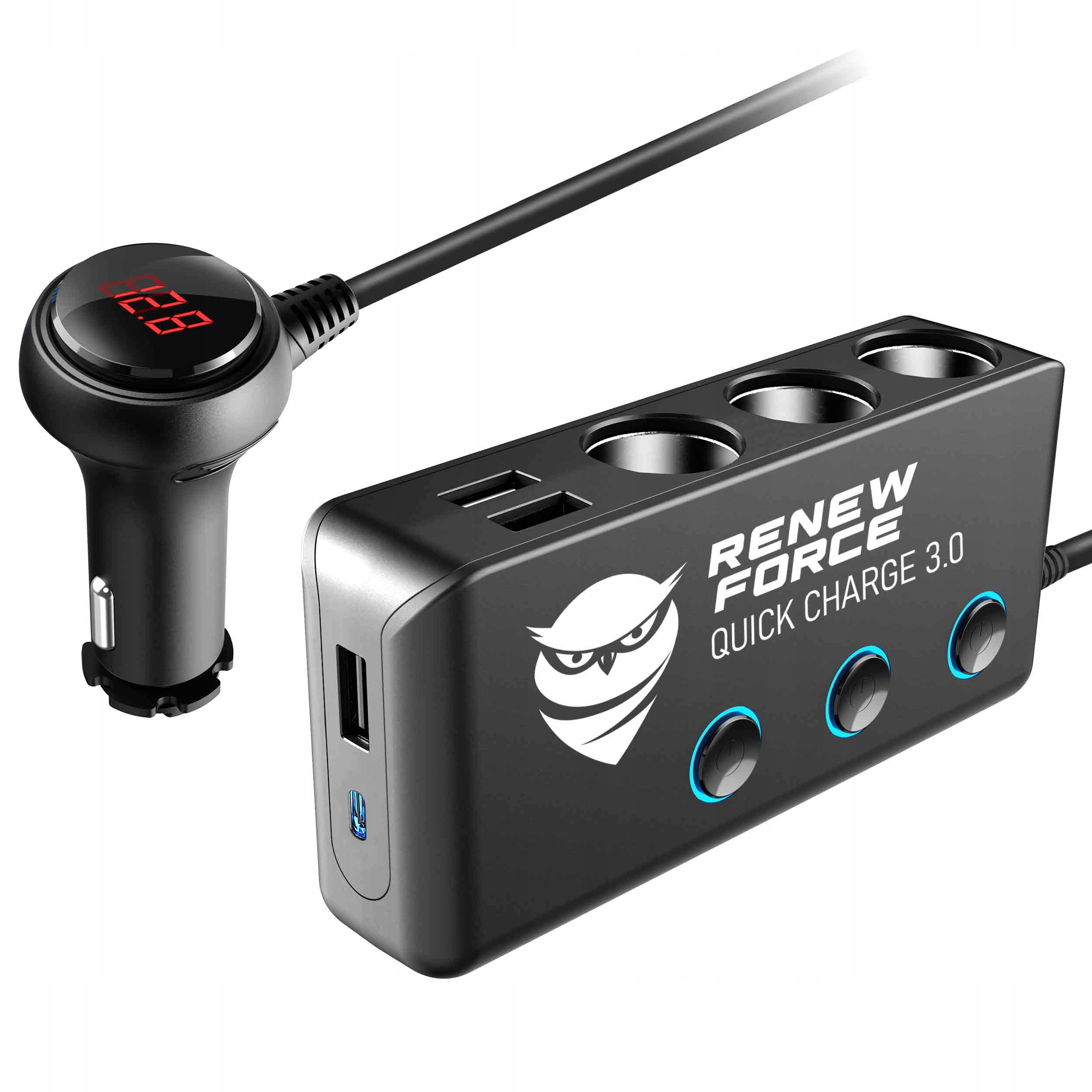SZYBKIE ŁADOWANIE QUICK CHARGE 3.0 Zapomnij o długich oczekiwaniach na pełne naładowanie urządzeń elektronicznych w Twoim samochodzie. Ten rozdzielacz jest wyposażony w 3 PORTY USB z czego jeden obsługuje technologię Quick Charge 3.0, co oznacza, że możesz cieszyć się niesamowicie szybkim ładowaniem smartfonów, tabletów, nawigacji GPS i innych urządzeń, które zasilasz w samochodzie. Już kilka minut podłączenia i Twoje urządzenia są gotowe do działania!