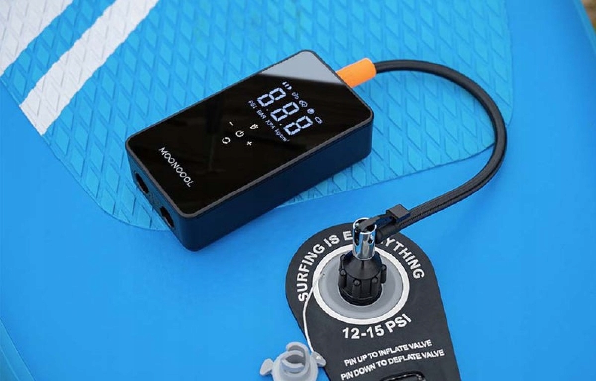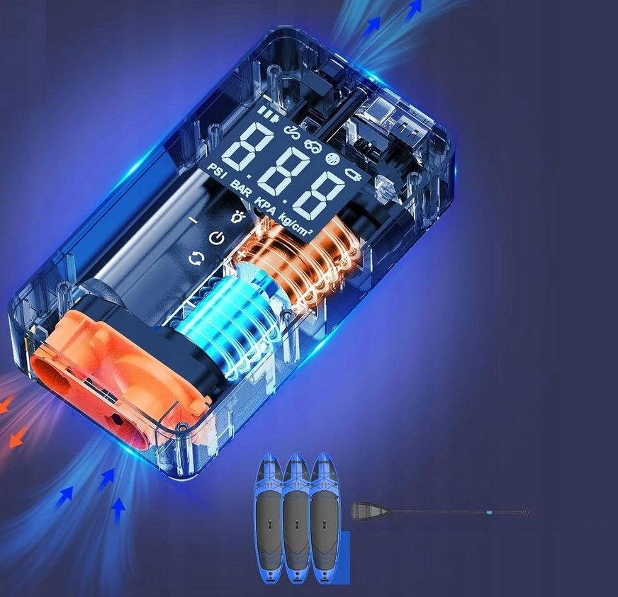 1. Użyj dużego węża (przytrzymaj go ręcznie, nie jest to problem z niekompatybilnością), wybierz tryb 4 z ikoną Paddleboard i naciśnij Start (Wskazówka: w tym trybie aktualna wartość PSI nie jest wyświetlana w czasie rzeczywistym). 2. Ustaw tryb SUP i uruchom 3. Przy ciśnieniu 95% zmienić na wąż ciśnieniowy 4. Ustawienie trybu bez SUP na 12-15 psi (kroki dotyczące nadmuchiwania deski do wiosłowania znajdują się na zdjęciach lub filmach). ---Nie zaleca się stosowania na dużych deskach wiosłowych